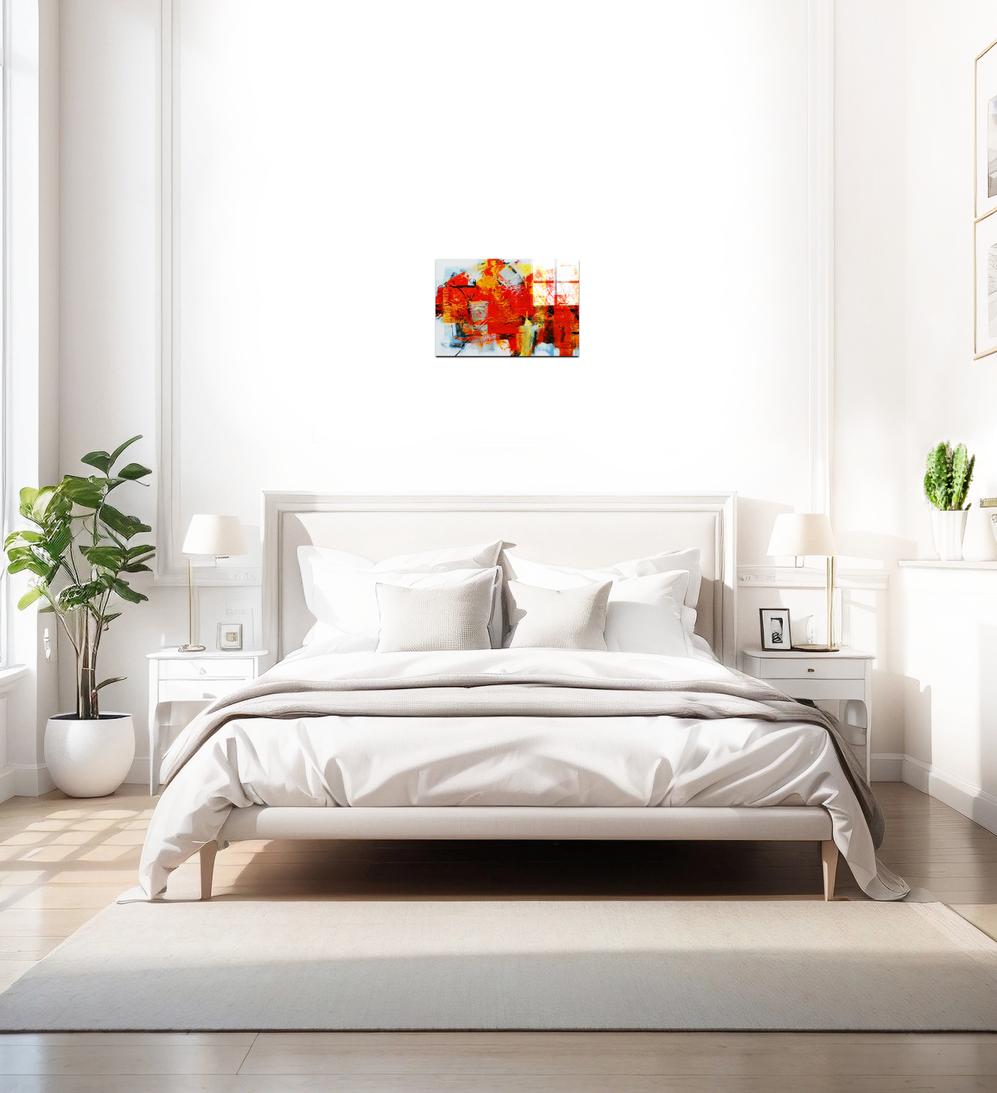 The artist's mastery of colour brings out an extraordinary range of reds and golds that seem to burn with inner light, suggesting both earthly passion and divine presence. Through our precise photography and print enhancement process, we've maintained every nuance of the original artwork's emotional intensity, from the bold gestural movements to the subtle spiritual undertones that emerge from the composition's depths. The result is an image that serves both as a celebration of faith and a powerful piece of contemporary art.