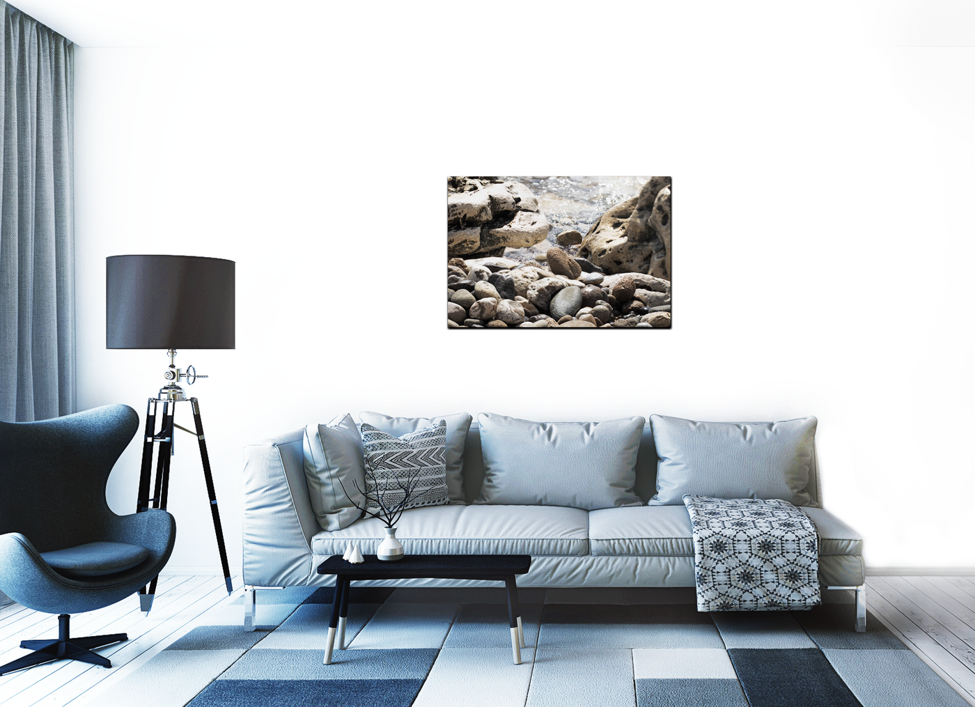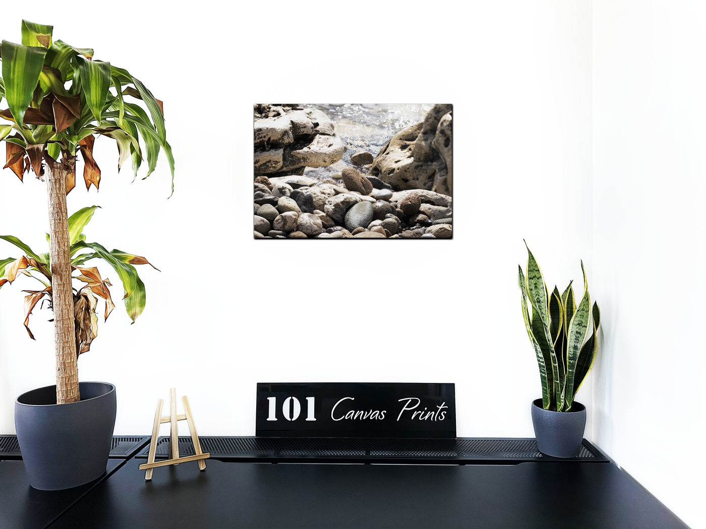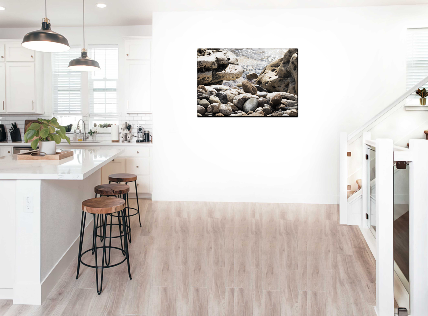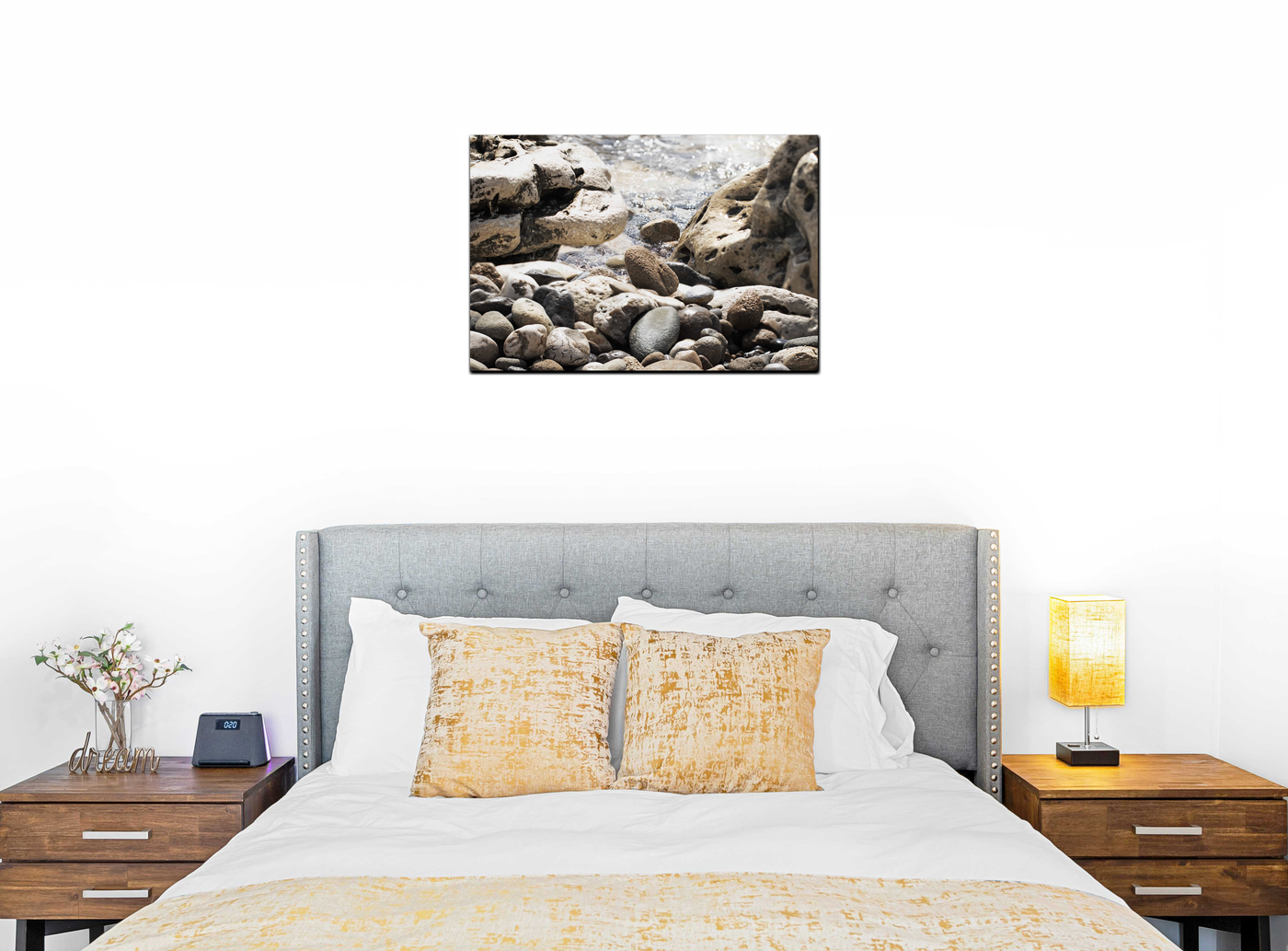 Immerse yourself in the beauty of a rocky shoreline with this stunning Acrylic print. The photograph offers a close-up view of a pebble-strewn beach, where an array of stones in various sizes and textures creates a captivating natural mosaic. From the foreground's sharp focus on individual pebbles to the softly blurred water in the background, the image draws the eye through layers of detail and atmosphere.