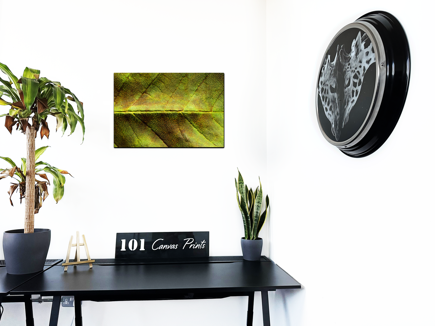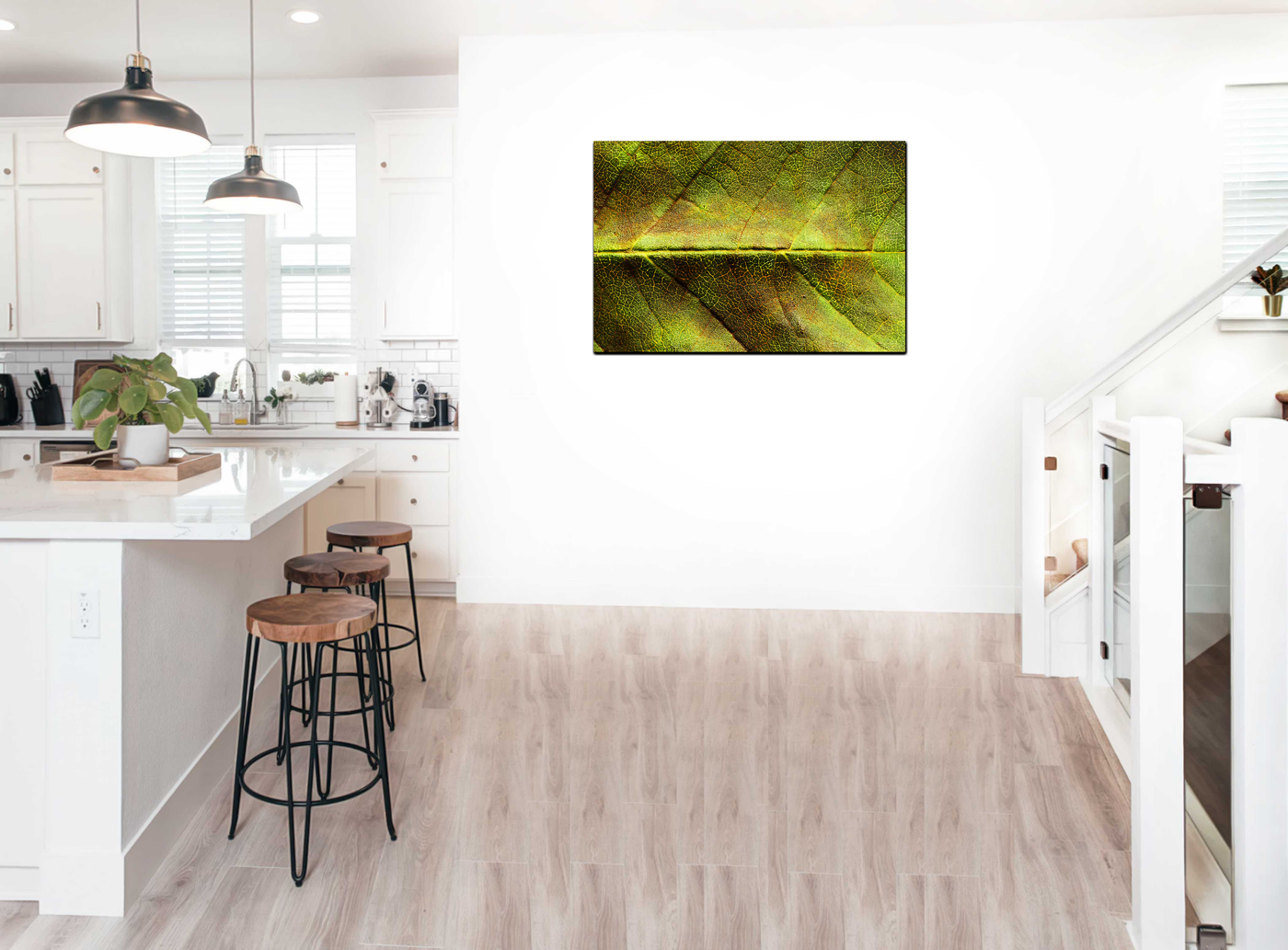 Delve into the hidden beauty of nature with this striking Acrylic print featuring an extreme close-up of a leaf. The photograph transforms the leaf into an abstract landscape, revealing a world of intricate patterns and rich textures. The colour palette is a symphony of greens, from deep, shadowy tones to bright, almost luminous hues, creating a sense of depth and dimension.