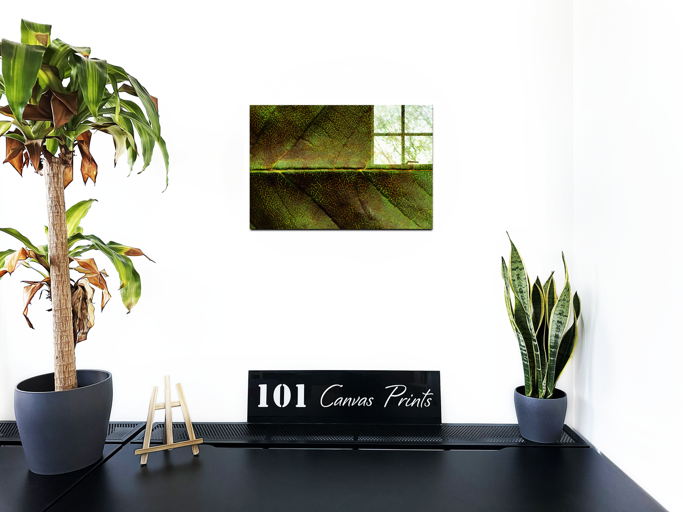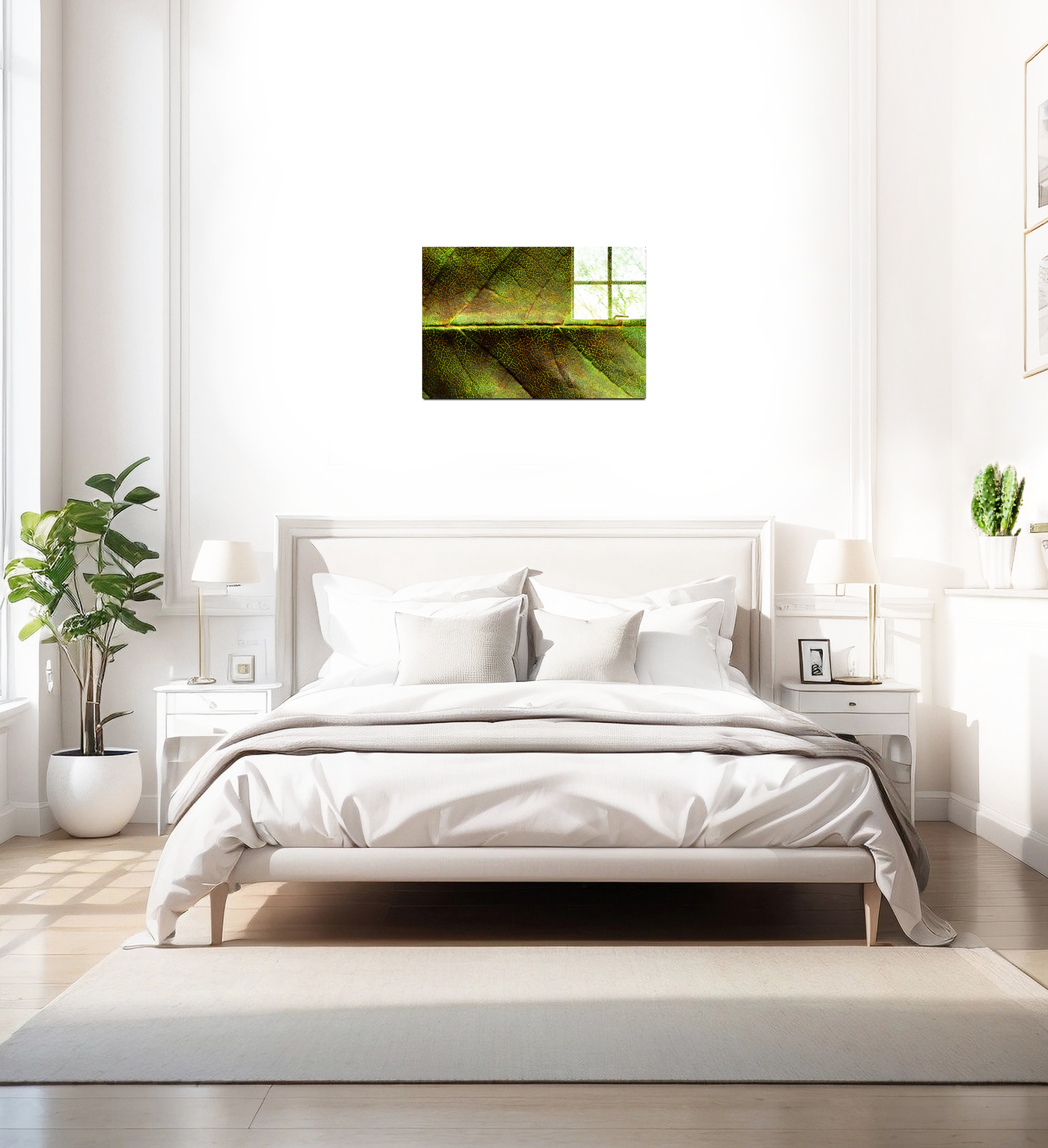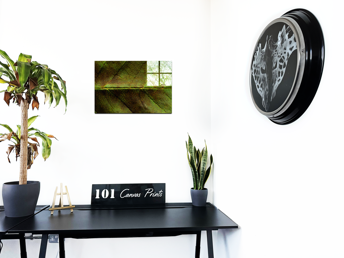 Delve into the hidden beauty of nature with this striking Acrylic print featuring an extreme close-up of a leaf. The photograph transforms the leaf into an abstract landscape, revealing a world of intricate patterns and rich textures. The colour palette is a symphony of greens, from deep, shadowy tones to bright, almost luminous hues, creating a sense of depth and dimension.