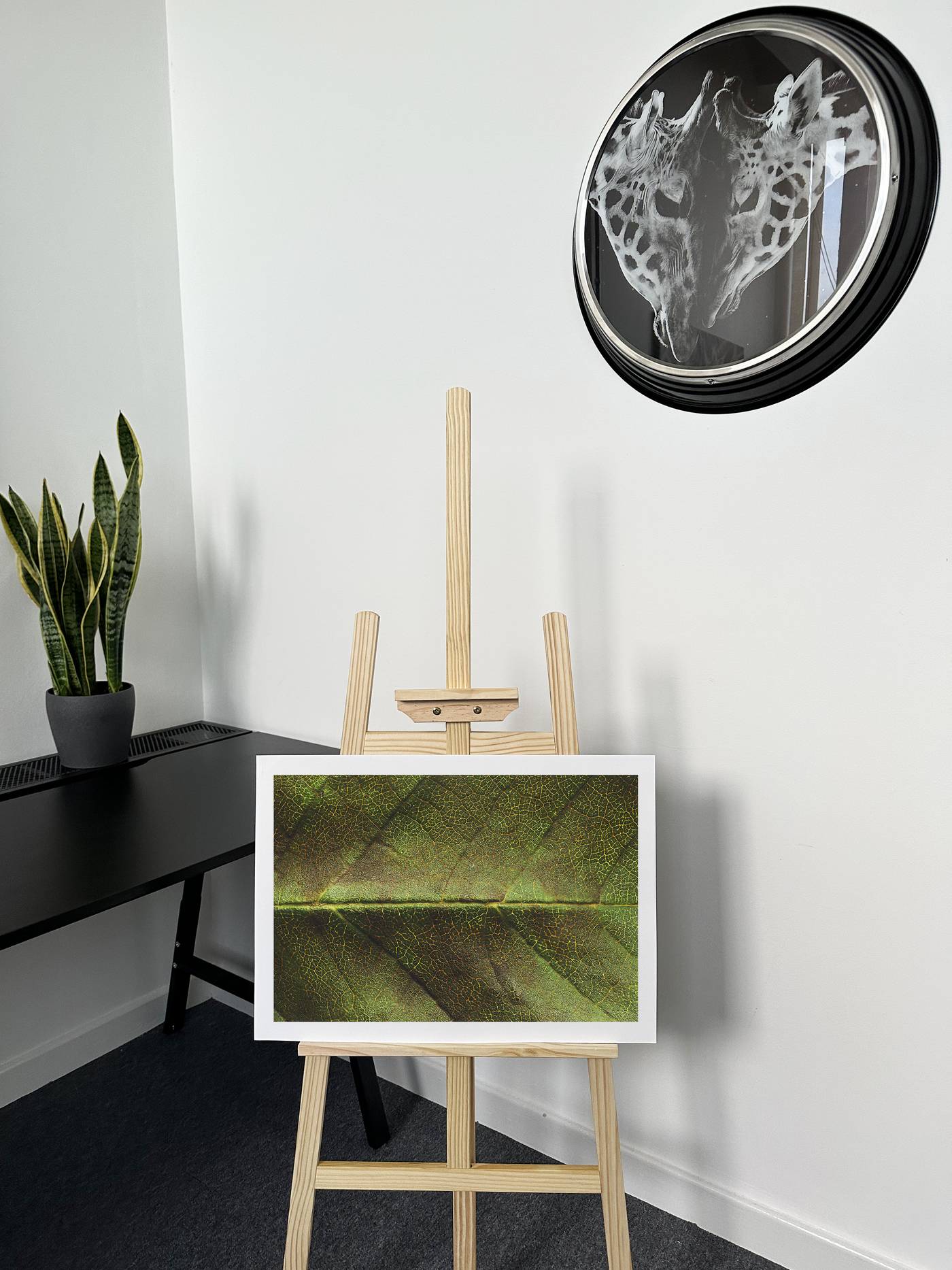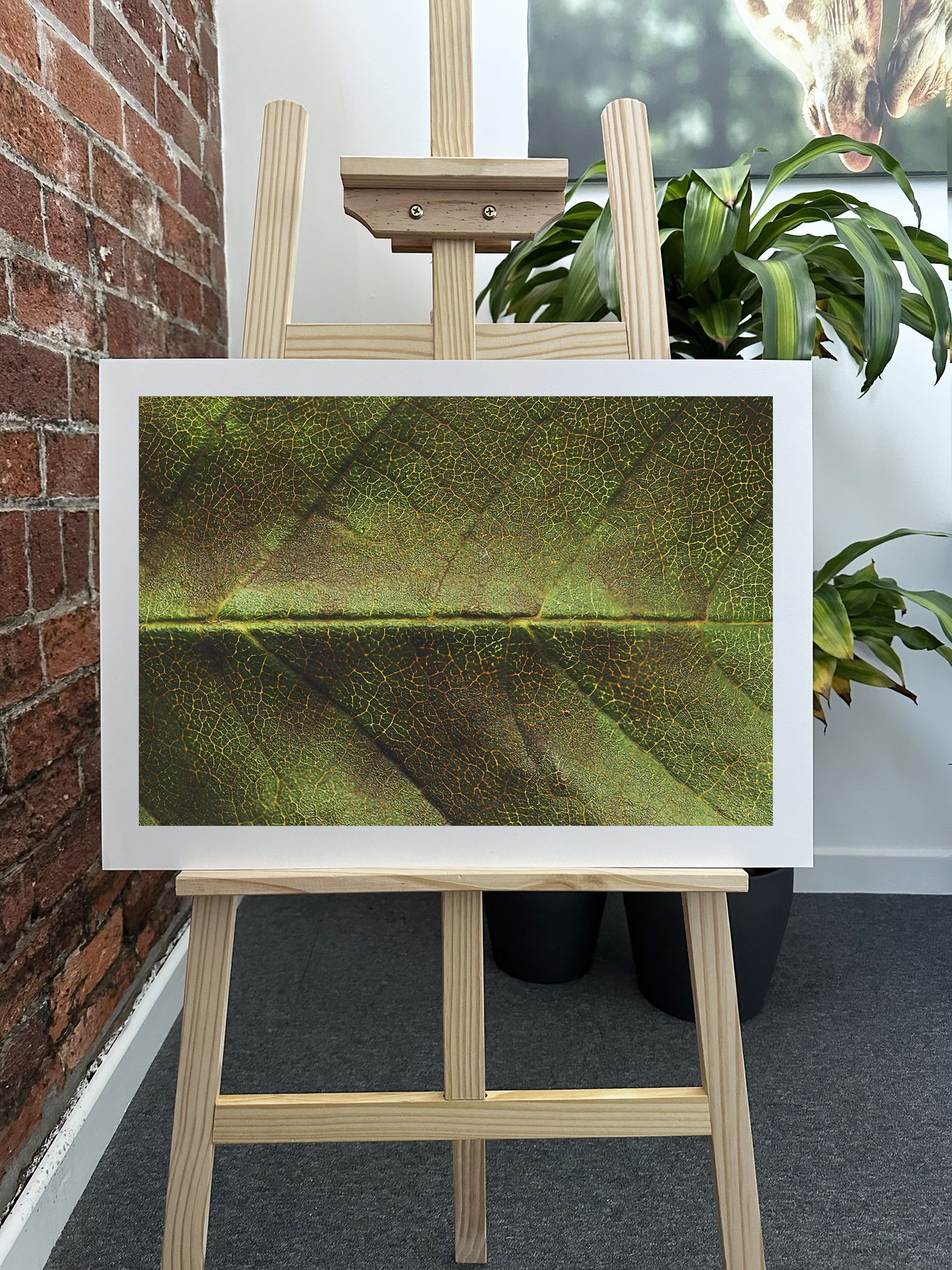 Rendered on Fine Art paper, this print takes on a tactile quality that beautifully complements the subject matter. The textured surface of the Fine Art print harmonises with the leaf's natural textures, enhancing the organic feel of the piece. This artwork would bring a sense of tranquillity and connection to nature to any space, inviting viewers to pause and marvel at the complexity found in even the simplest elements of the natural world.