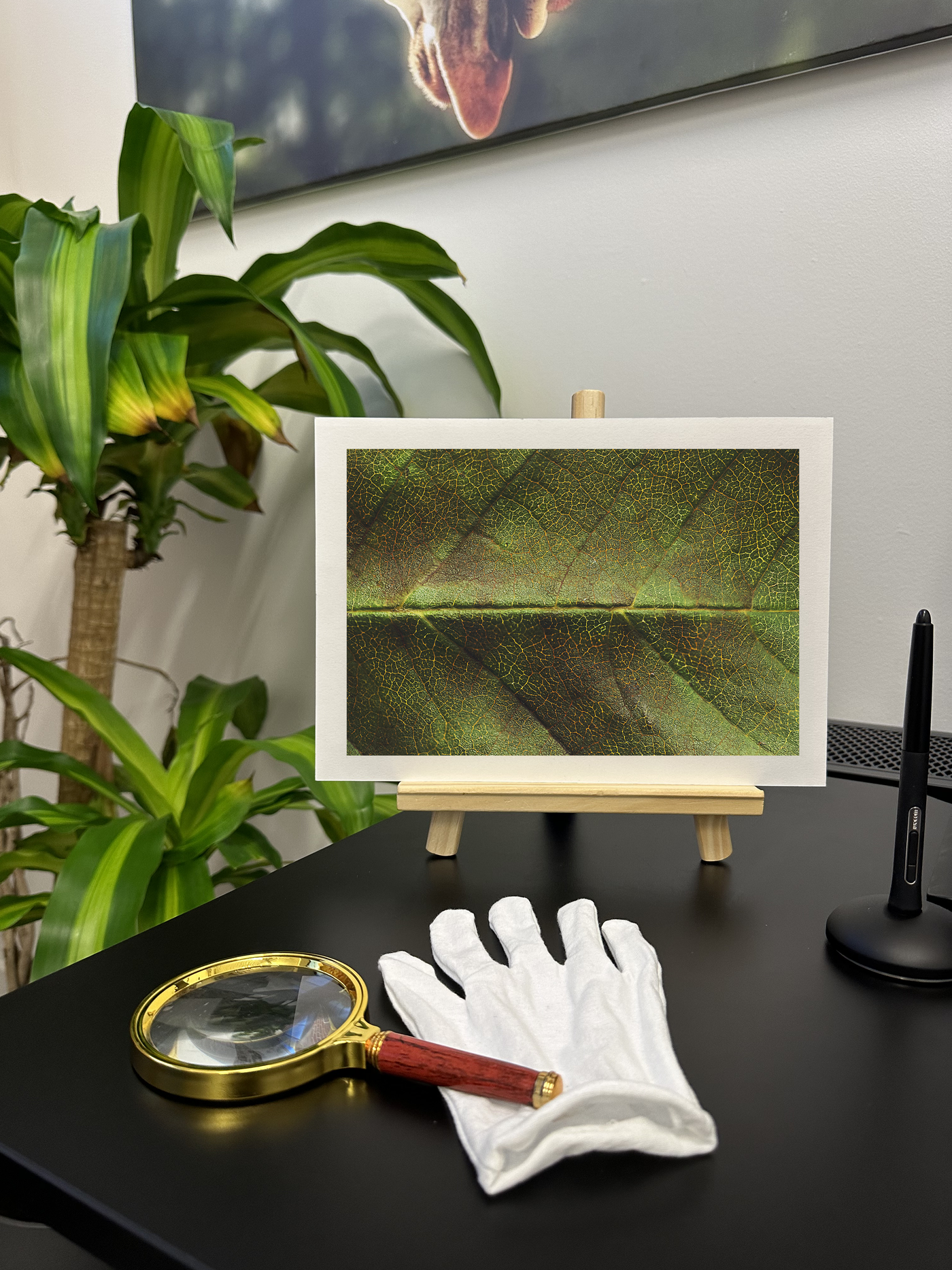 Rendered on Fine Art paper, this print takes on a tactile quality that beautifully complements the subject matter. The textured surface of the Fine Art print harmonises with the leaf's natural textures, enhancing the organic feel of the piece. This artwork would bring a sense of tranquillity and connection to nature to any space, inviting viewers to pause and marvel at the complexity found in even the simplest elements of the natural world.