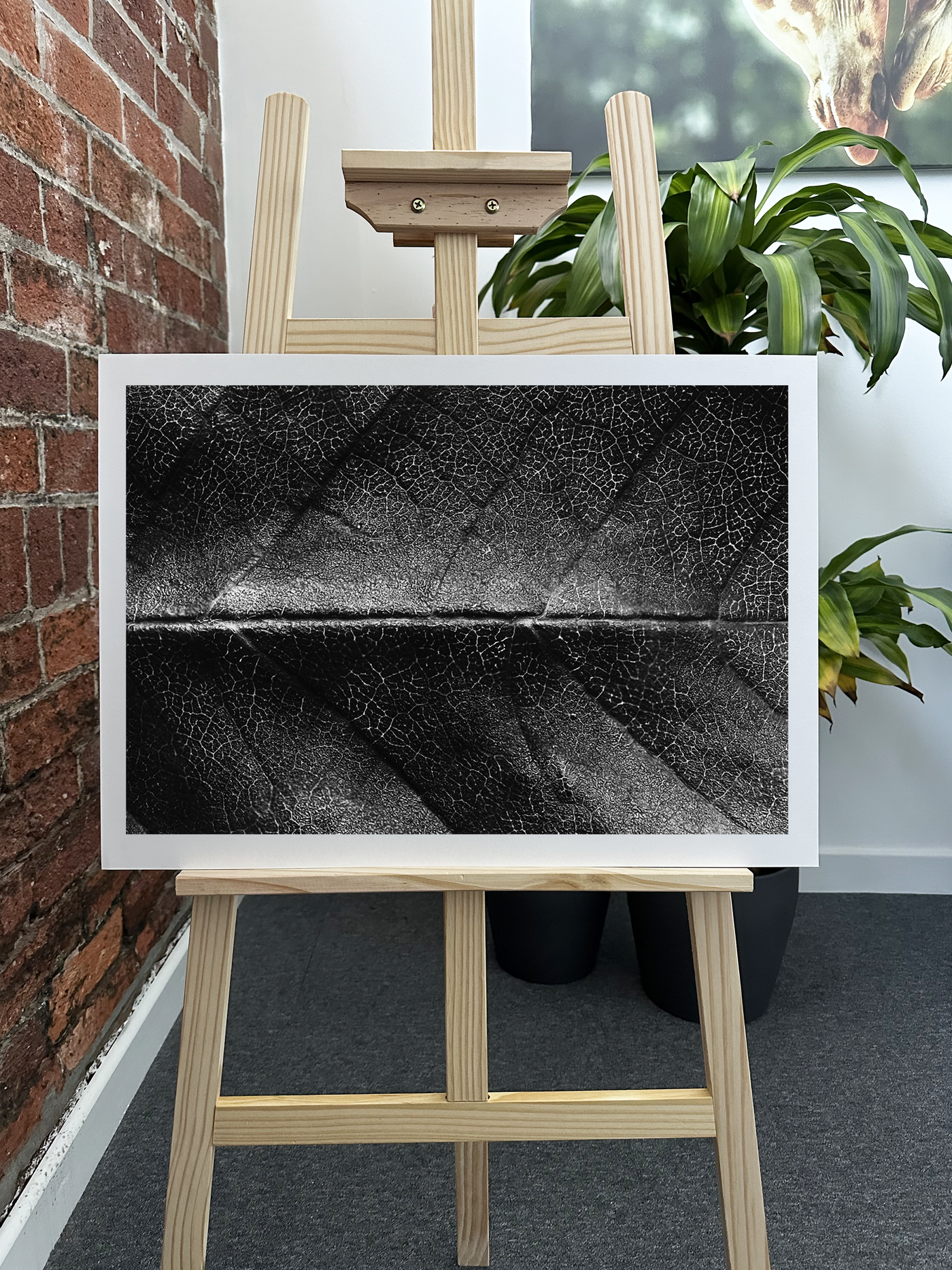 Rendered on Fine Art paper, this print takes on a tactile quality that beautifully complements the subject matter. The textured surface of the Monochrome Fine Art print harmonises with the leaf's natural textures, enhancing the organic feel of the piece. This artwork would bring a sense of tranquillity and connection to nature to any space, inviting viewers to pause and marvel at the complexity found in even the simplest elements of the natural world.