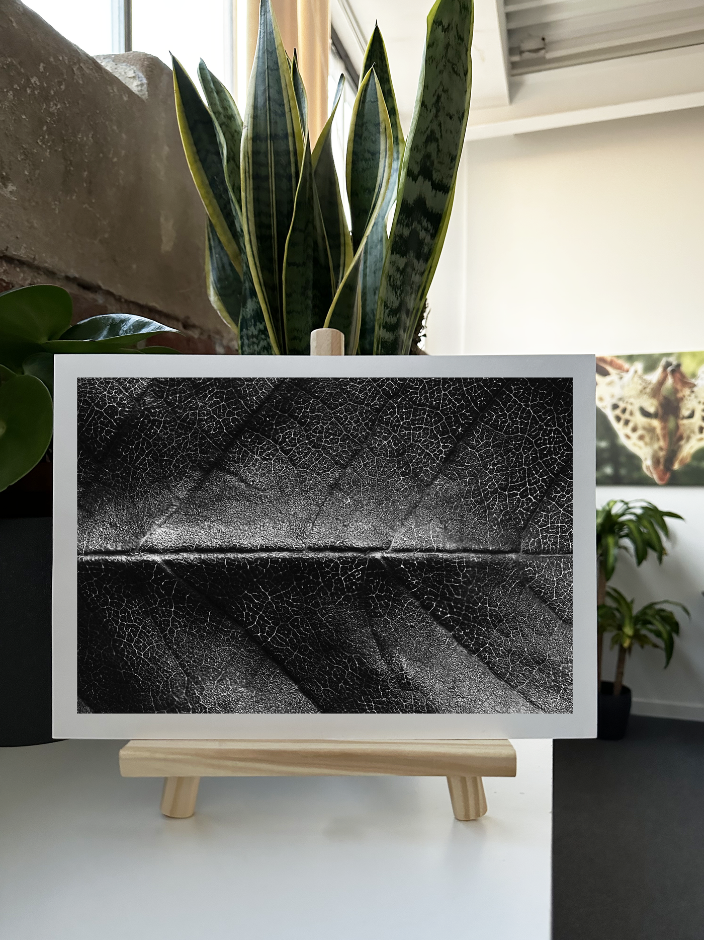 Rendered on Fine Art paper, this print takes on a tactile quality that beautifully complements the subject matter. The textured surface of the Monochrome Fine Art print harmonises with the leaf's natural textures, enhancing the organic feel of the piece. This artwork would bring a sense of tranquillity and connection to nature to any space, inviting viewers to pause and marvel at the complexity found in even the simplest elements of the natural world.