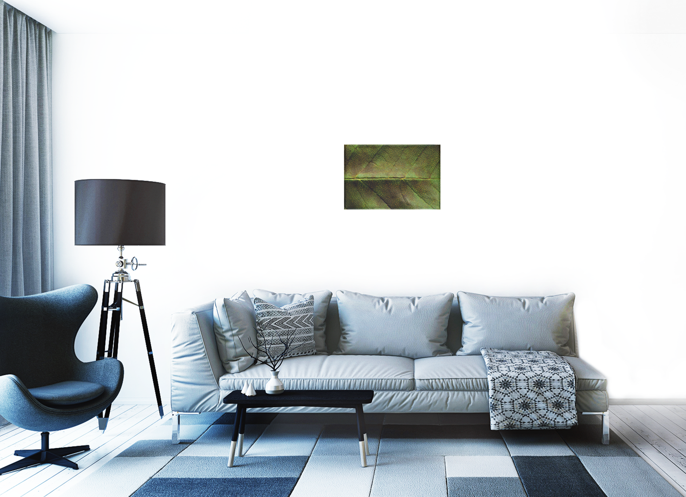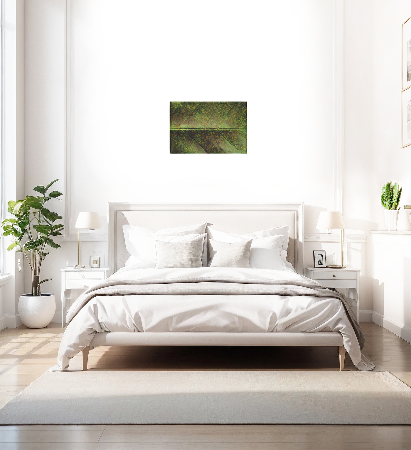 Rendered on Canvas, this print takes on a tactile quality that beautifully complements the subject matter. The textured surface of the Canvas print harmonises with the leaf's natural textures, enhancing the organic feel of the piece. This artwork would bring a sense of tranquillity and connection to nature to any space, inviting viewers to pause and marvel at the complexity found in even the simplest elements of the natural world.