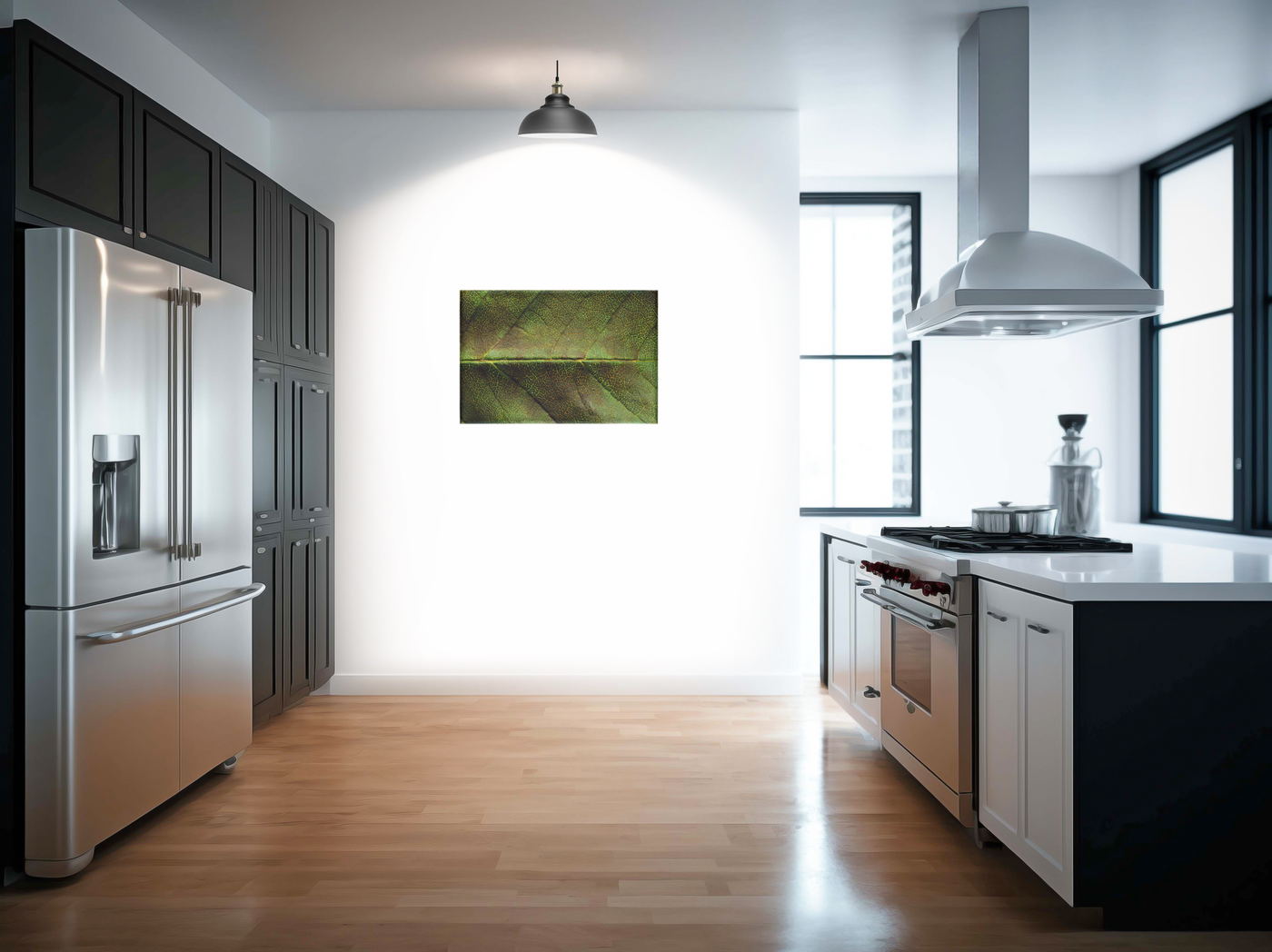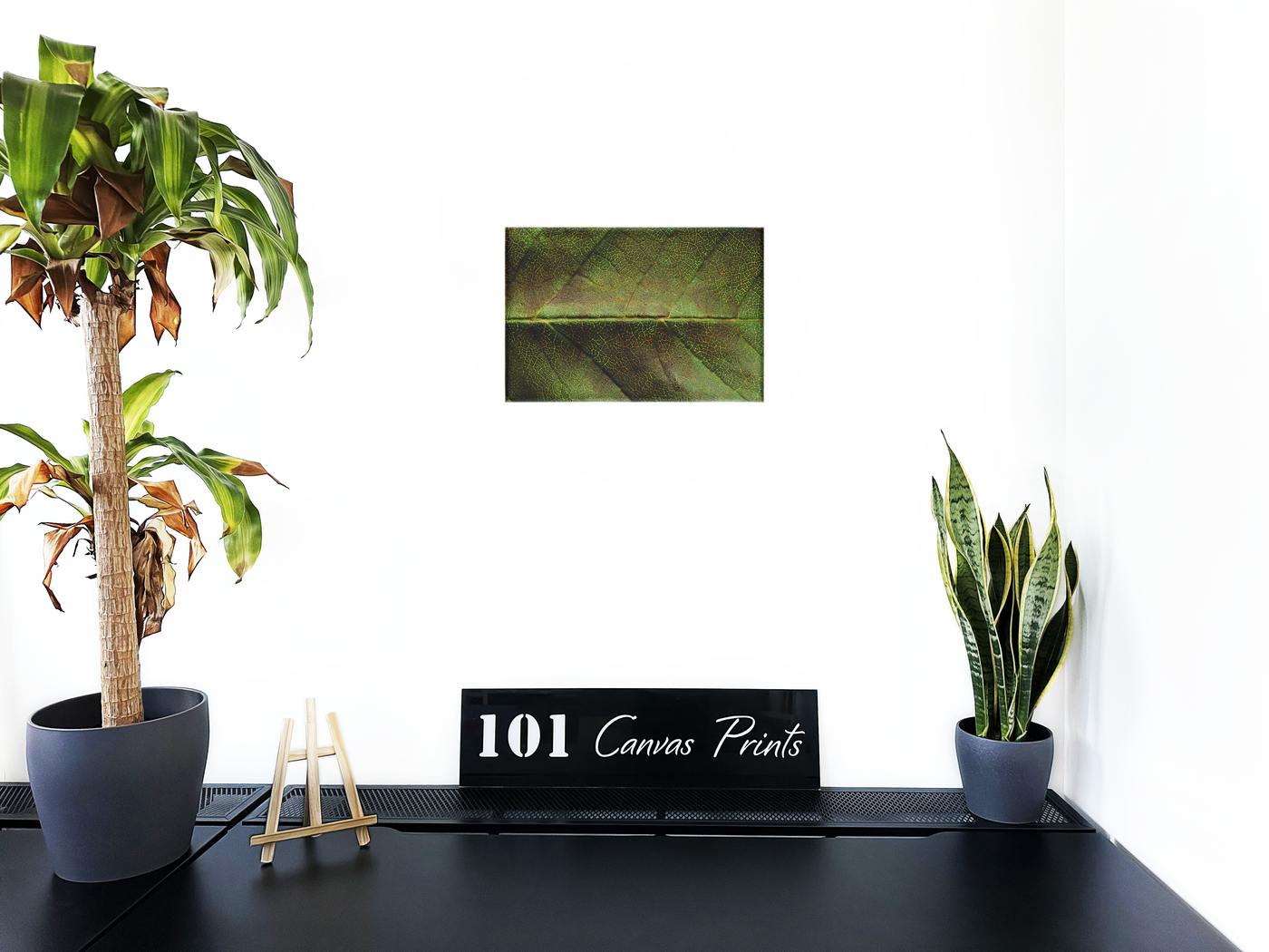 This captivating Canvas print offers an intimate glimpse into the intricate world of nature, showcasing the mesmerising detail of a leaf's surface. The macro photograph reveals a tapestry of veins and cellular structures, transforming the humble leaf into a work of abstract art. Rich, earthy greens dominate the palette, with subtle variations ranging from deep forest hues to lighter, almost golden tones.