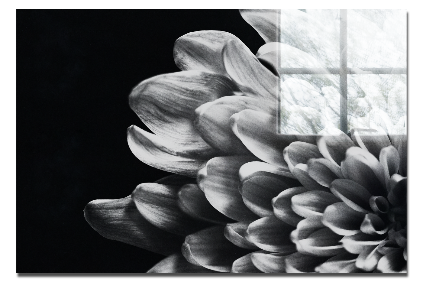 Capture the luminous beauty of a white dahlia with this stunning Monochrome Acrylic print. The macro photograph presents an intimate view of the flower's architecture, from its tightly clustered centre of textured white stamens to the graceful sweep of its outer petals. The stark black background serves to amplify the flower's radiant presence, creating a dramatic interplay of light and shadow.