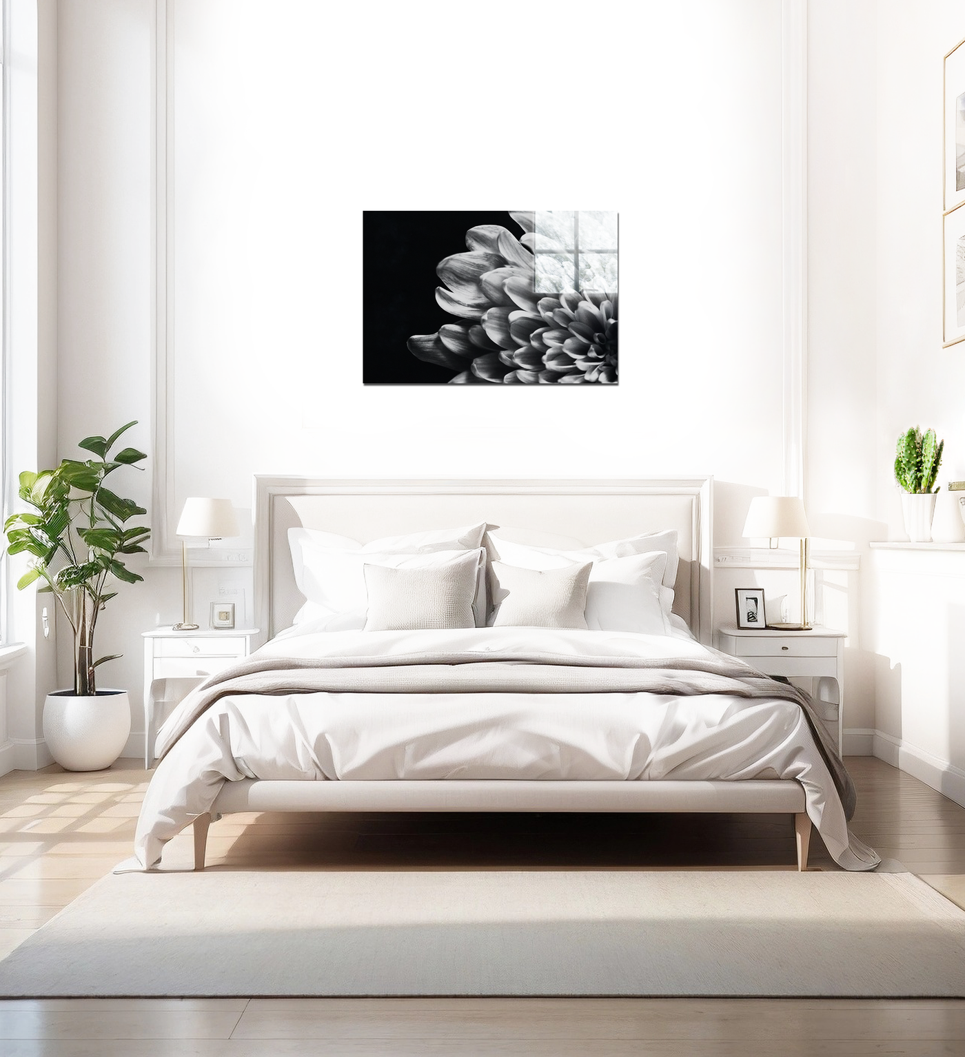 Produced as an Acrylic print, this piece takes on a new dimension of brilliance. The glossy surface enhances the contrast between the luminous flower and the deep black background, creating an almost three-dimensional effect. The Acrylic medium intensifies the silver hues, making the centre pop and lending the white petals an almost pearlescent sheen. This eye-catching print would make a bold statement in any contemporary interior, bringing a touch of natural artistry to your walls.