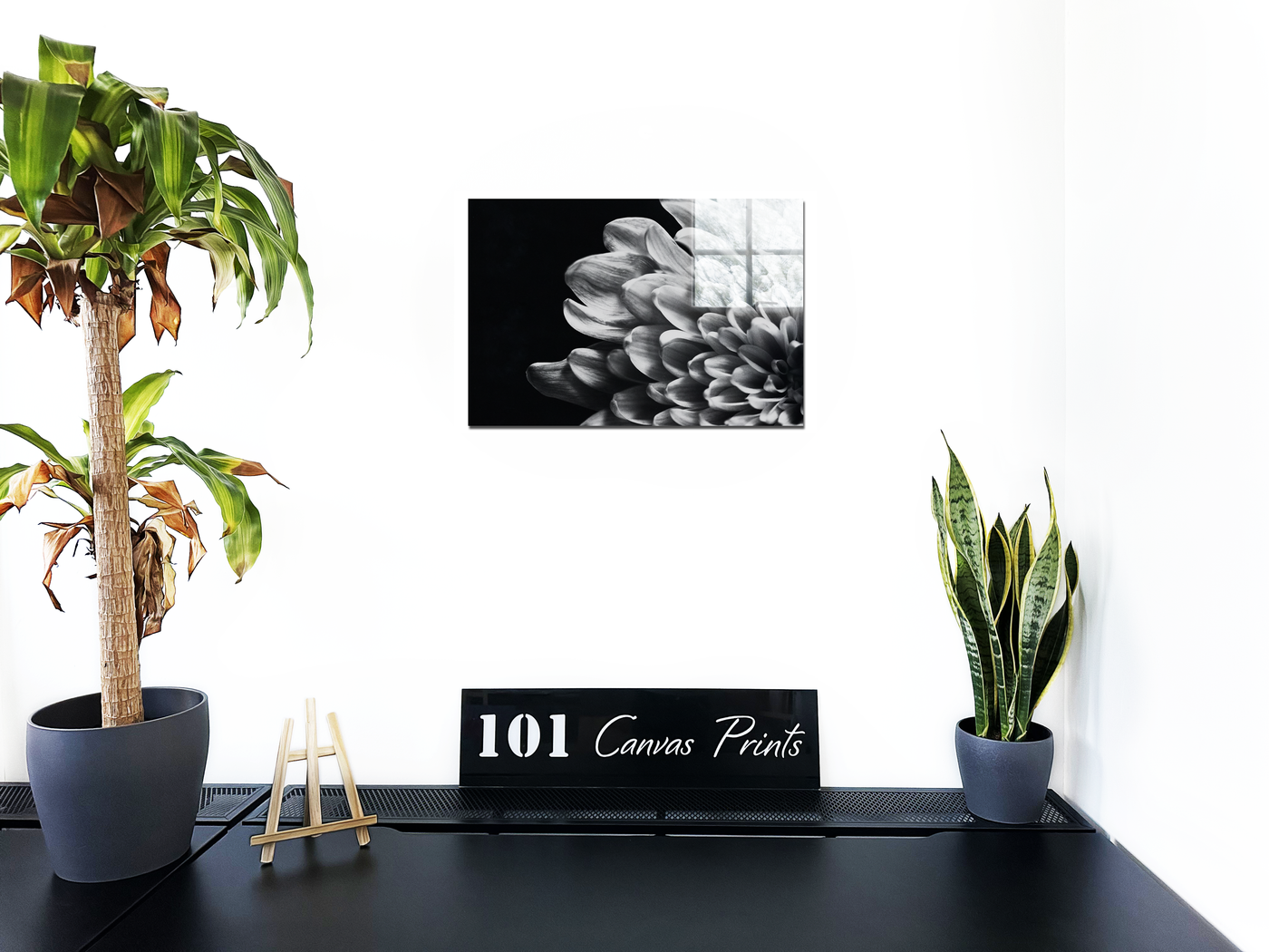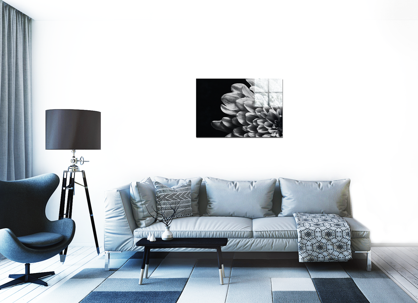 Capture the luminous beauty of a white dahlia with this stunning Monochrome Acrylic print. The macro photograph presents an intimate view of the flower's architecture, from its tightly clustered centre of textured white stamens to the graceful sweep of its outer petals. The stark black background serves to amplify the flower's radiant presence, creating a dramatic interplay of light and shadow.