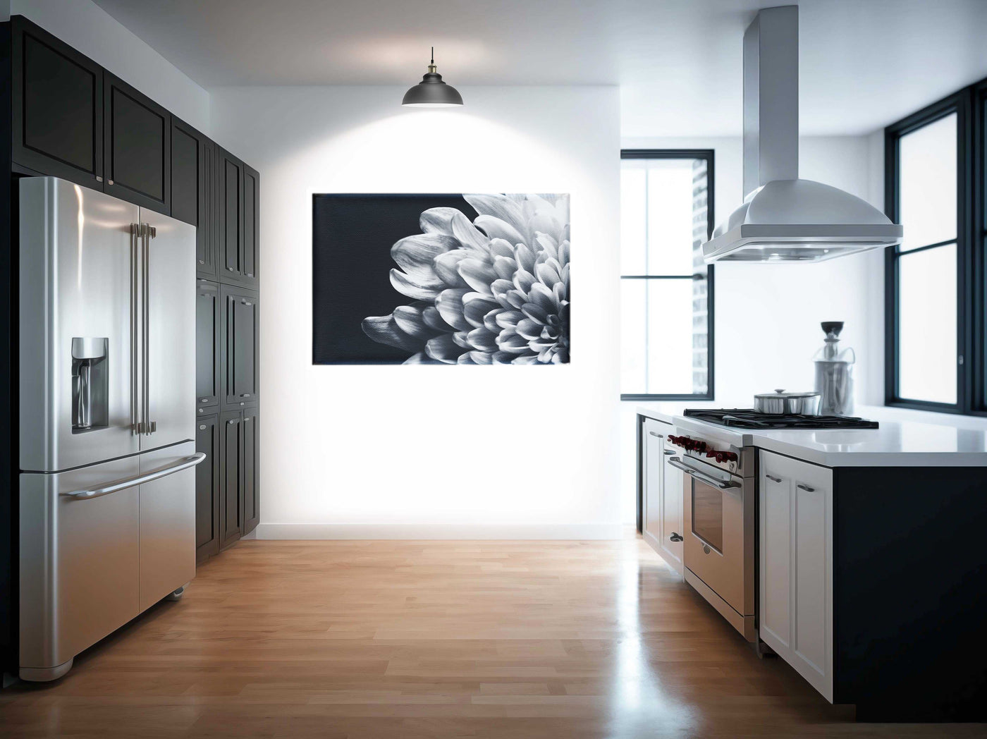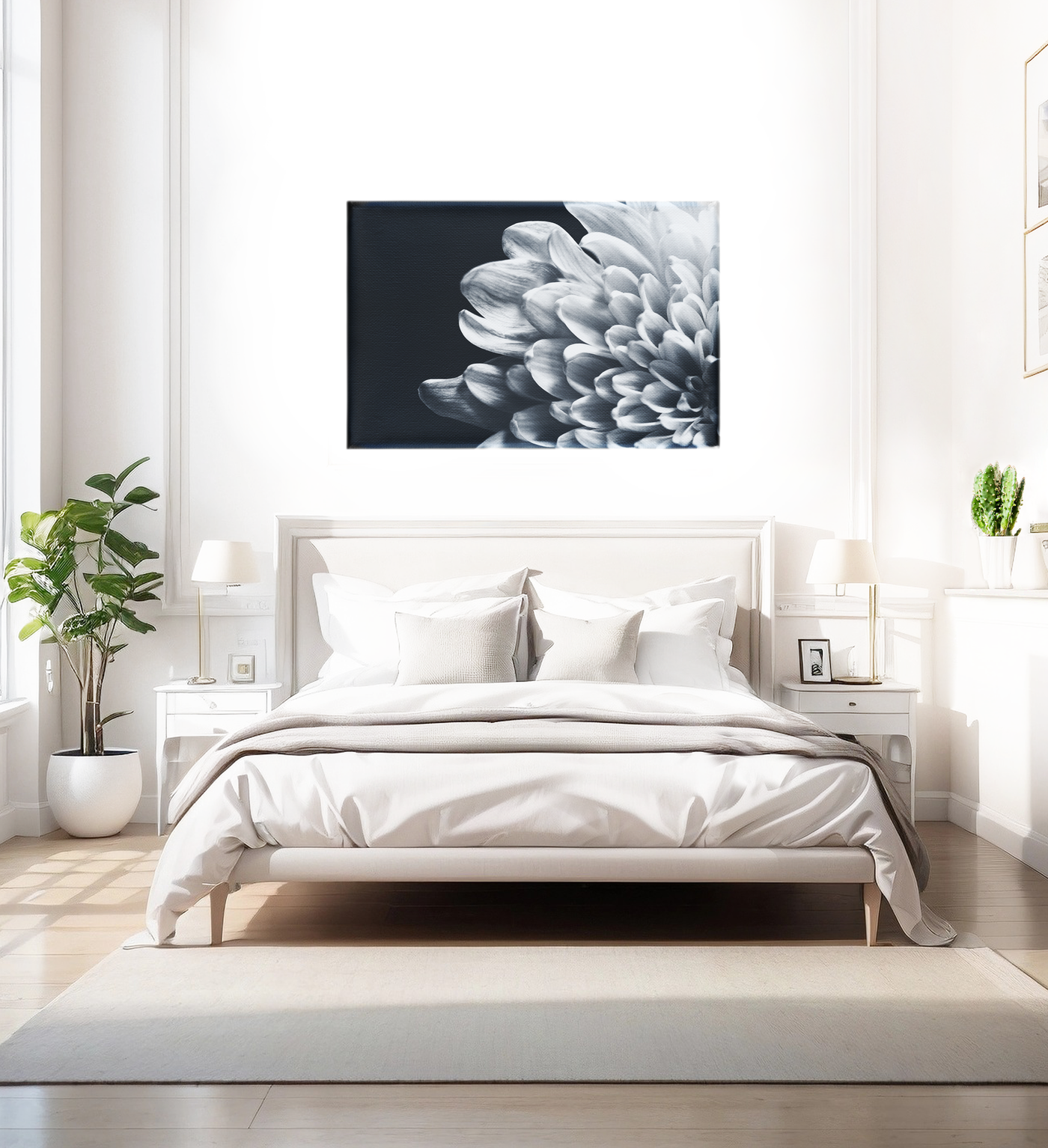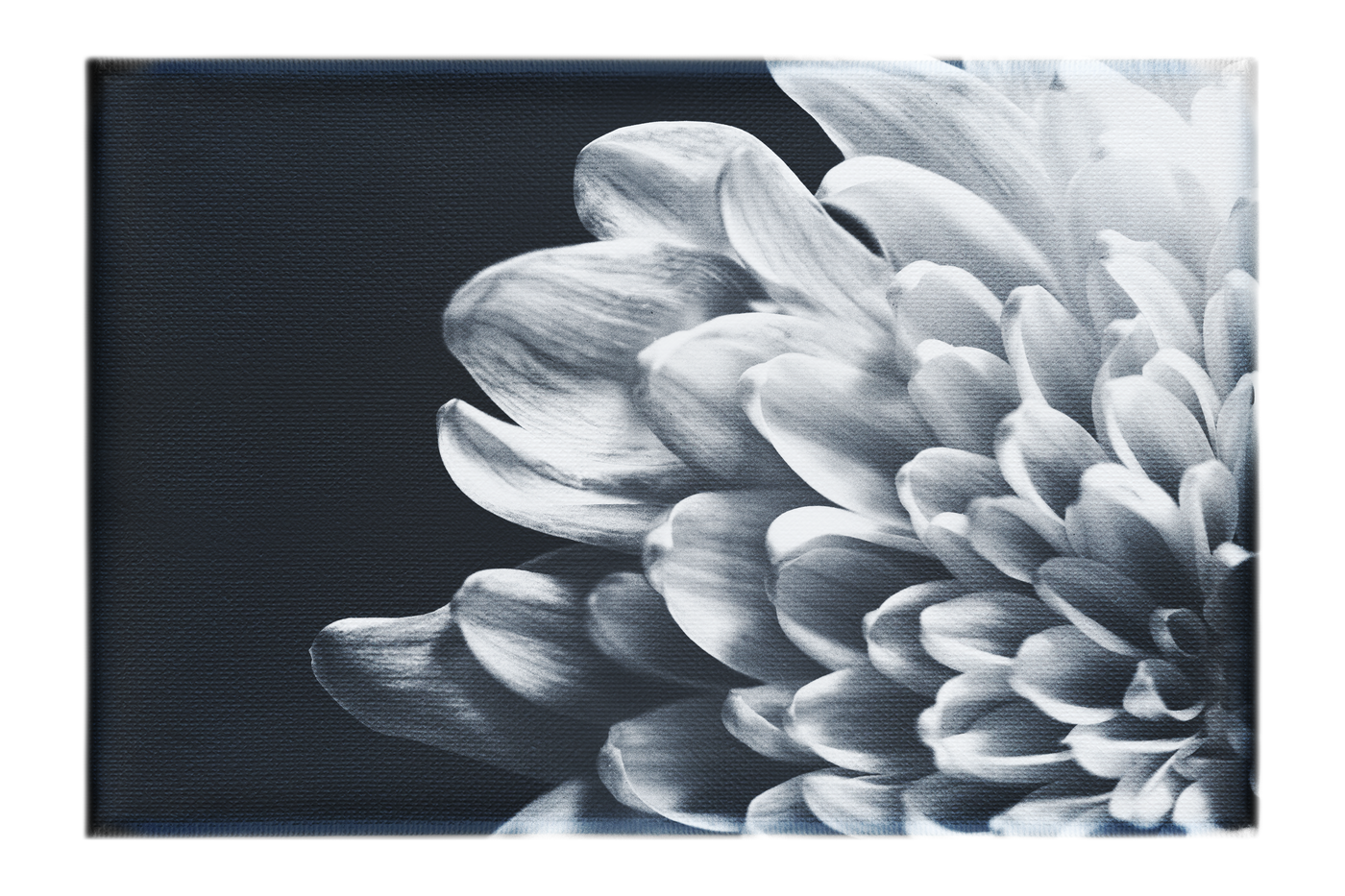 Printed on high-quality Canvas, this piece allows the texture of the flower to shine through. The matte finish of the Canvas softens the contrast between the white petals and dark background, creating a harmonious balance that invites contemplation. This print would make a captivating focal point in any room, bringing a touch of natural elegance to your living space.