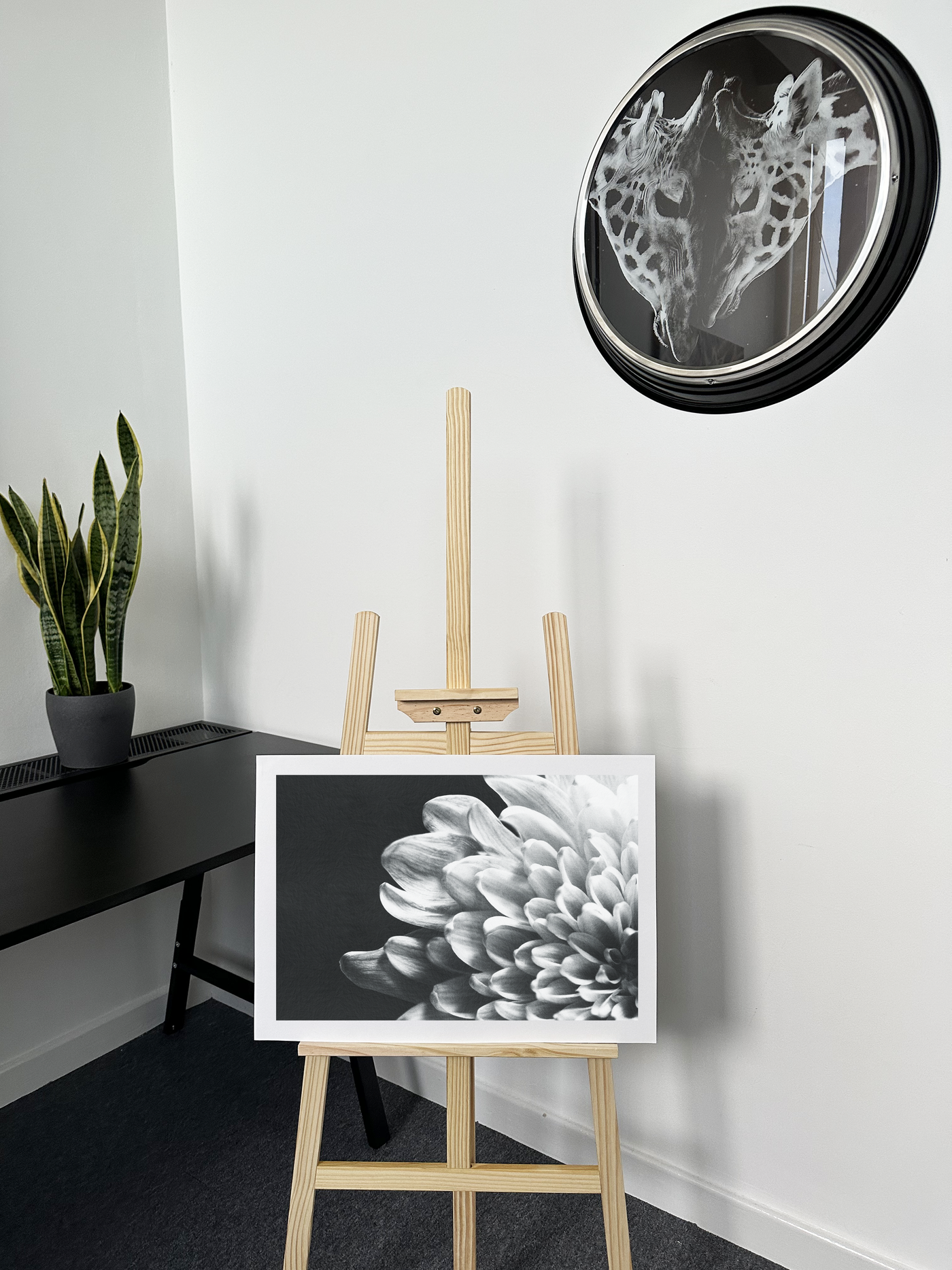 Printed on high-quality Fine Art paper, this piece allows the texture of the flower to shine through. The matte finish of the Fine Art print softens the contrast between the white petals and dark background, creating a harmonious balance that invites contemplation. This print would make a captivating focal point in any room, bringing a touch of natural elegance to your living space.