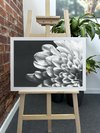 This striking Fine Art print showcases the ethereal beauty of a white dahlia in exquisite detail. The close-up composition reveals the flower's intricate layered petals, which unfurl gracefully from a vibrant white centre. Set against a stark black background, the flower's delicate form is dramatically highlighted, creating a stunning contrast that draws the eye.