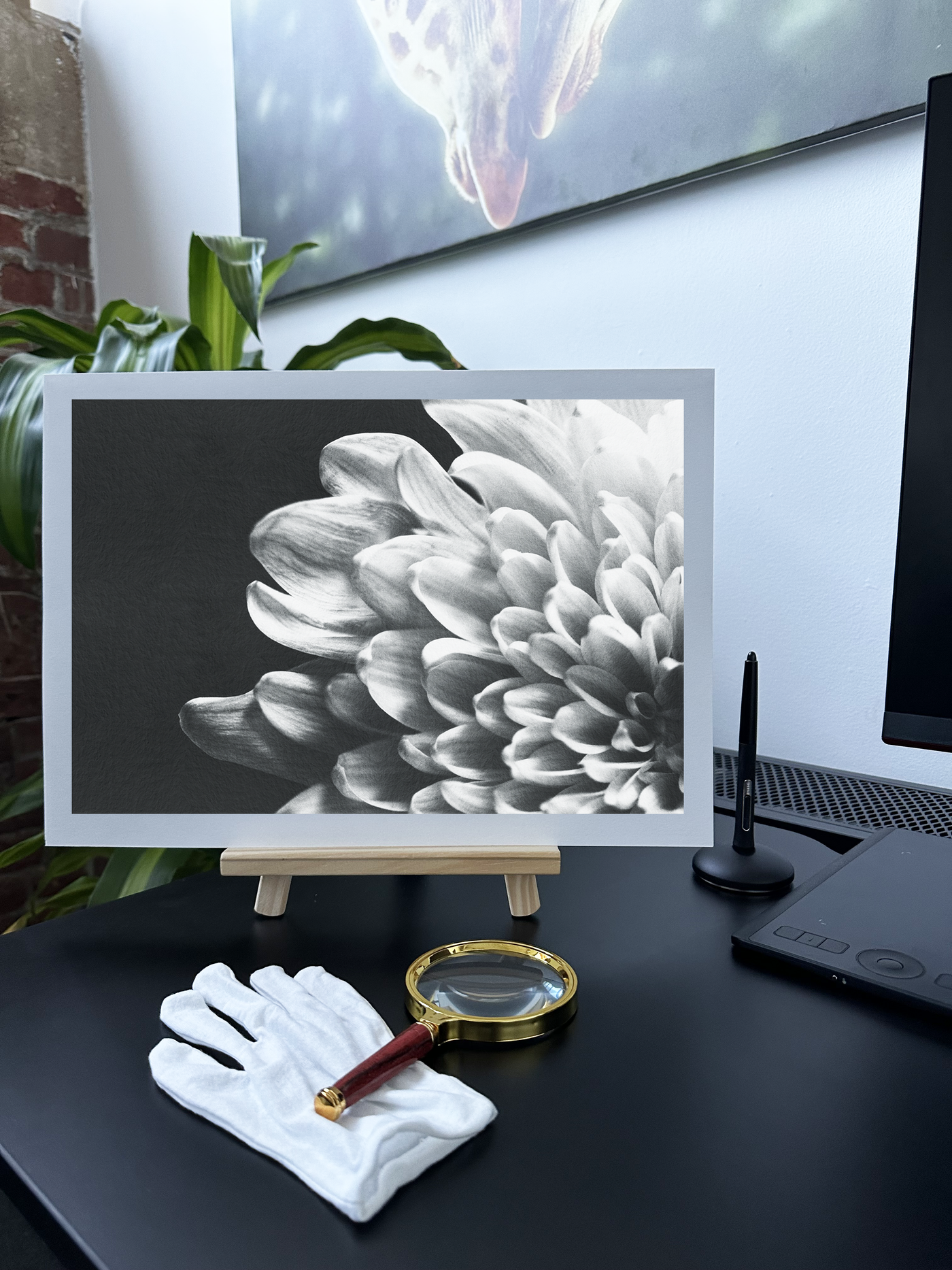 Our carefully handmade monochrome fine art prints are produced on Hahnemühle 308 matte cotton rag paper using Epson archival inks for exceptional detail and color accuracy. Each print features clean, precise edges and a textured surface that brings depth and richness to your chosen artwork, creating a gallery-worthy presentation.
