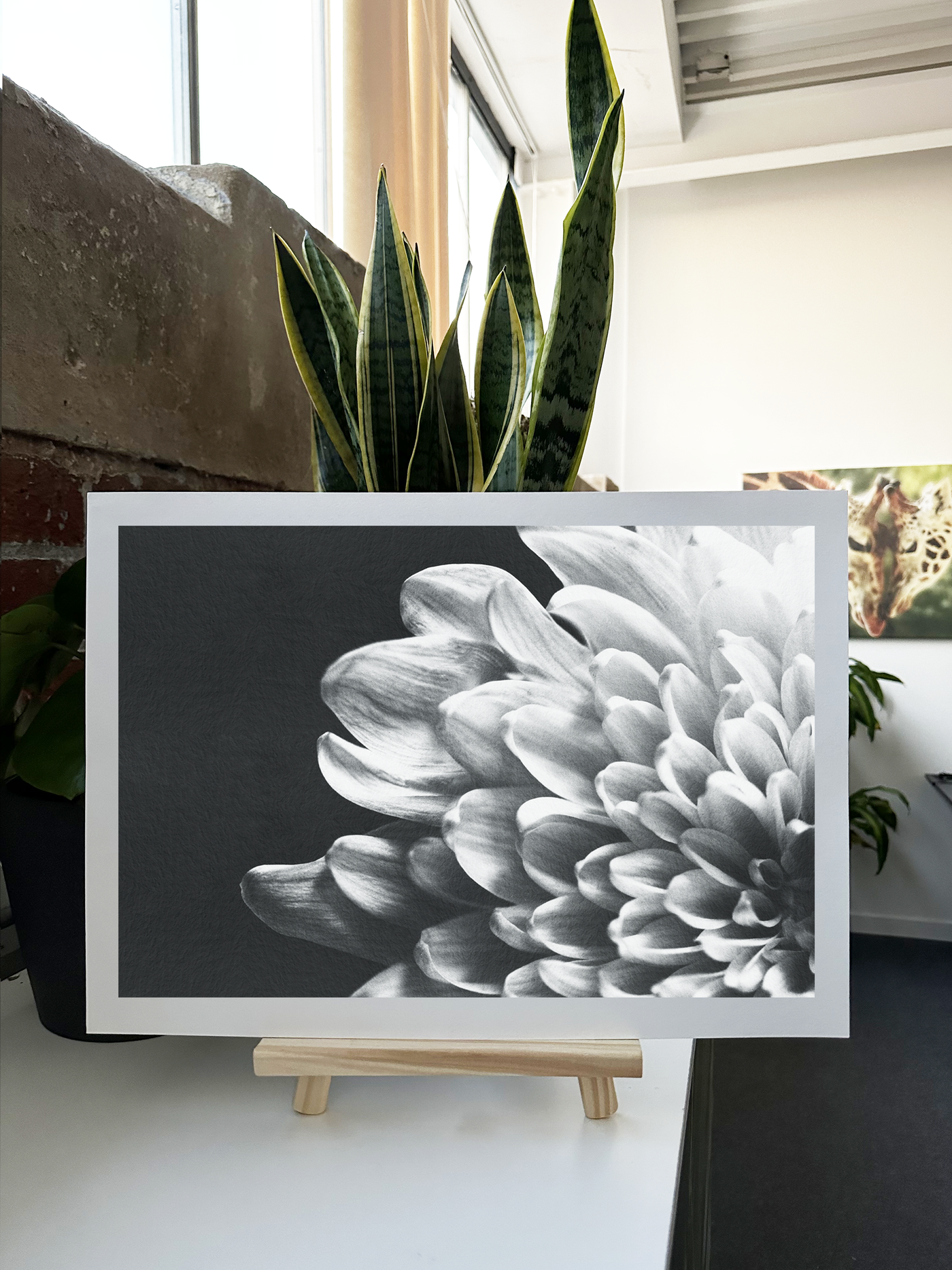 Printed on high-quality Fine Art paper, this piece allows the texture of the flower to shine through. The matte finish of the Monochrome Fine Art print softens the contrast between the white petals and dark background, creating a harmonious balance that invites contemplation. This print would make a captivating focal point in any room, bringing a touch of natural elegance to your living space.