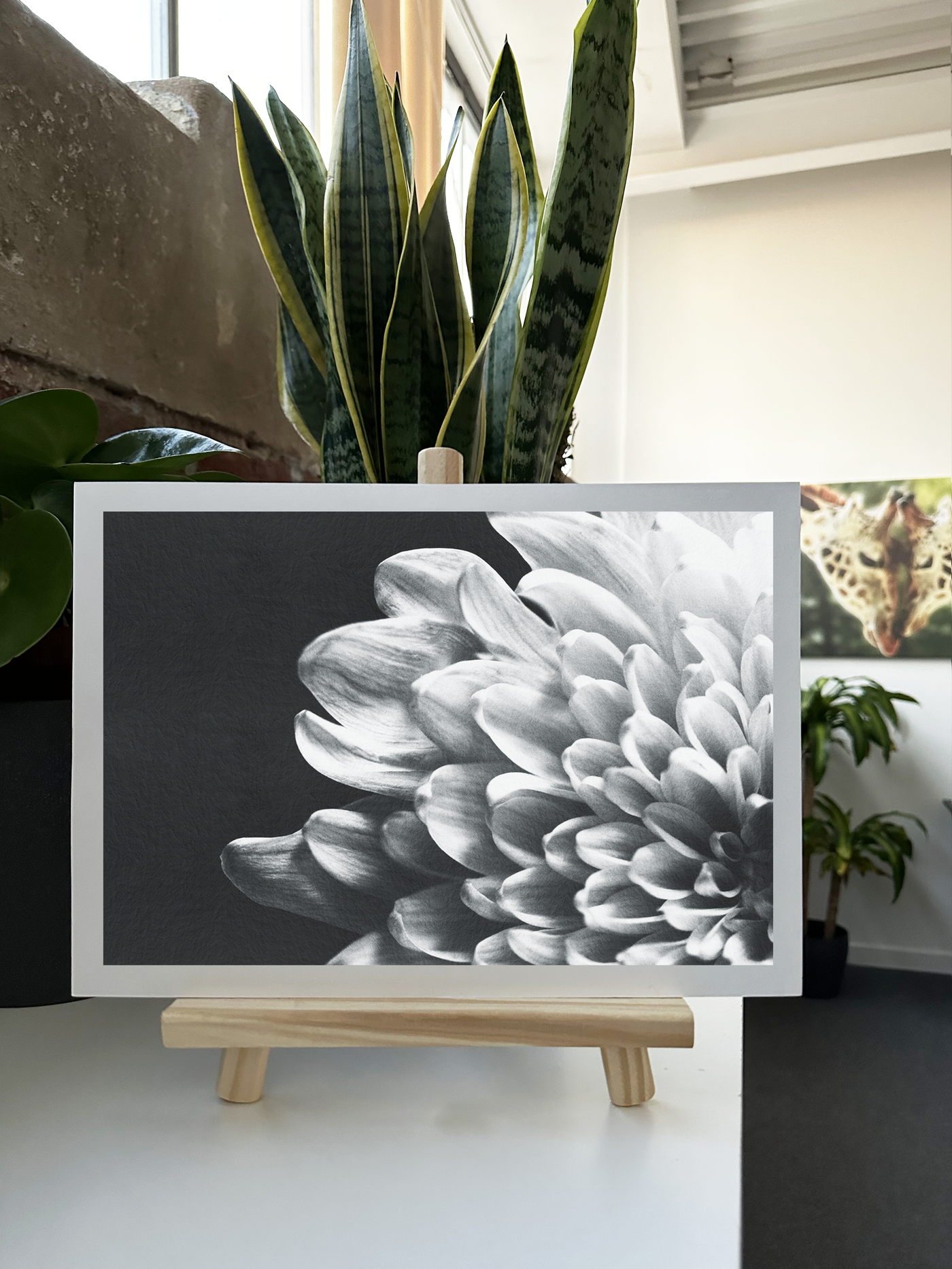 Printed on high-quality Fine Art paper, this piece allows the texture of the flower to shine through. The matte finish of the Monochrome Fine Art print softens the contrast between the white petals and dark background, creating a harmonious balance that invites contemplation. This print would make a captivating focal point in any room, bringing a touch of natural elegance to your living space.