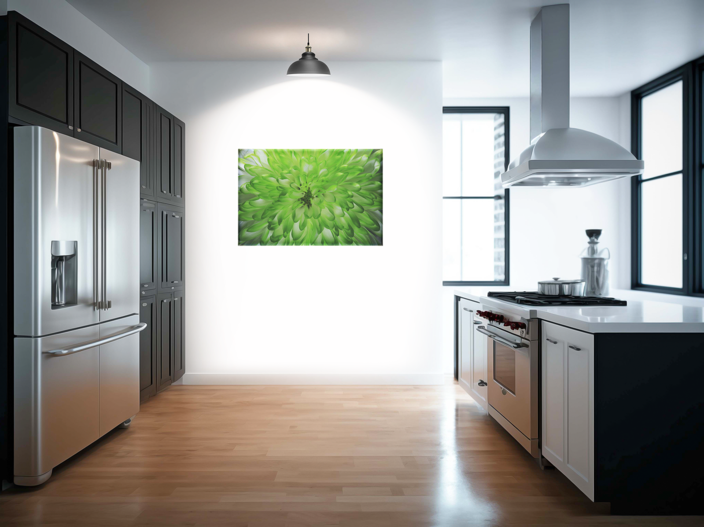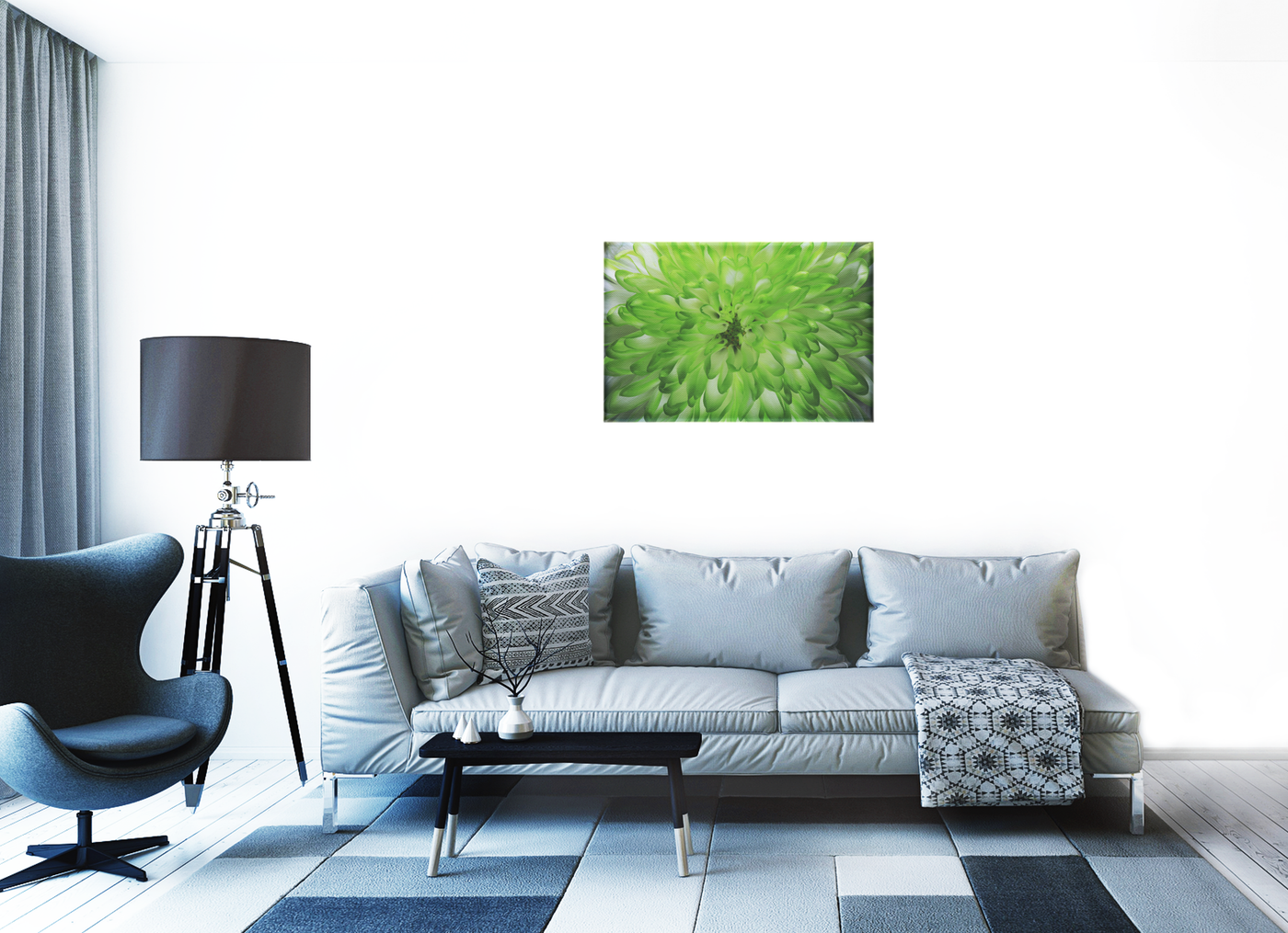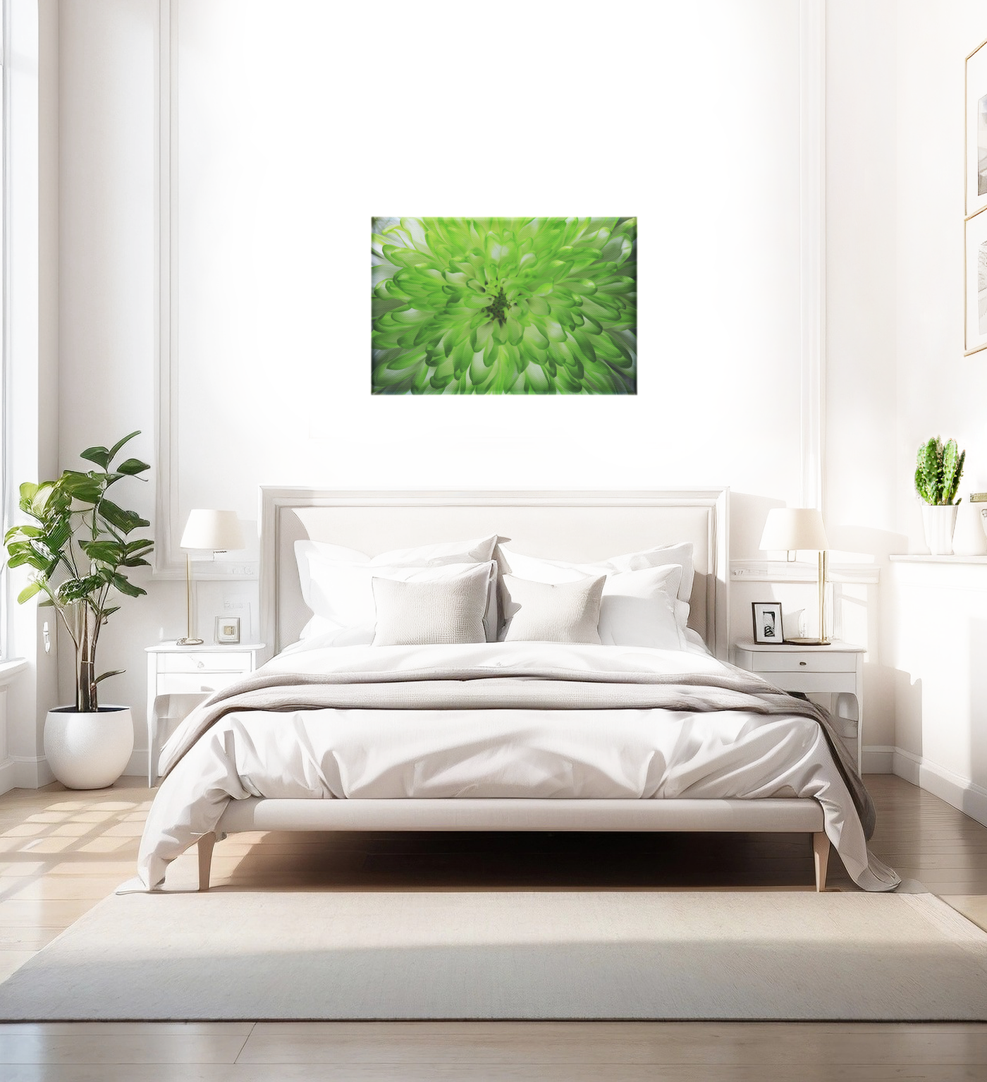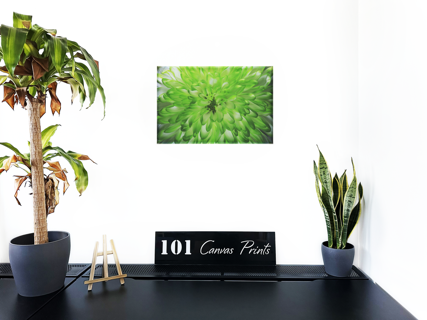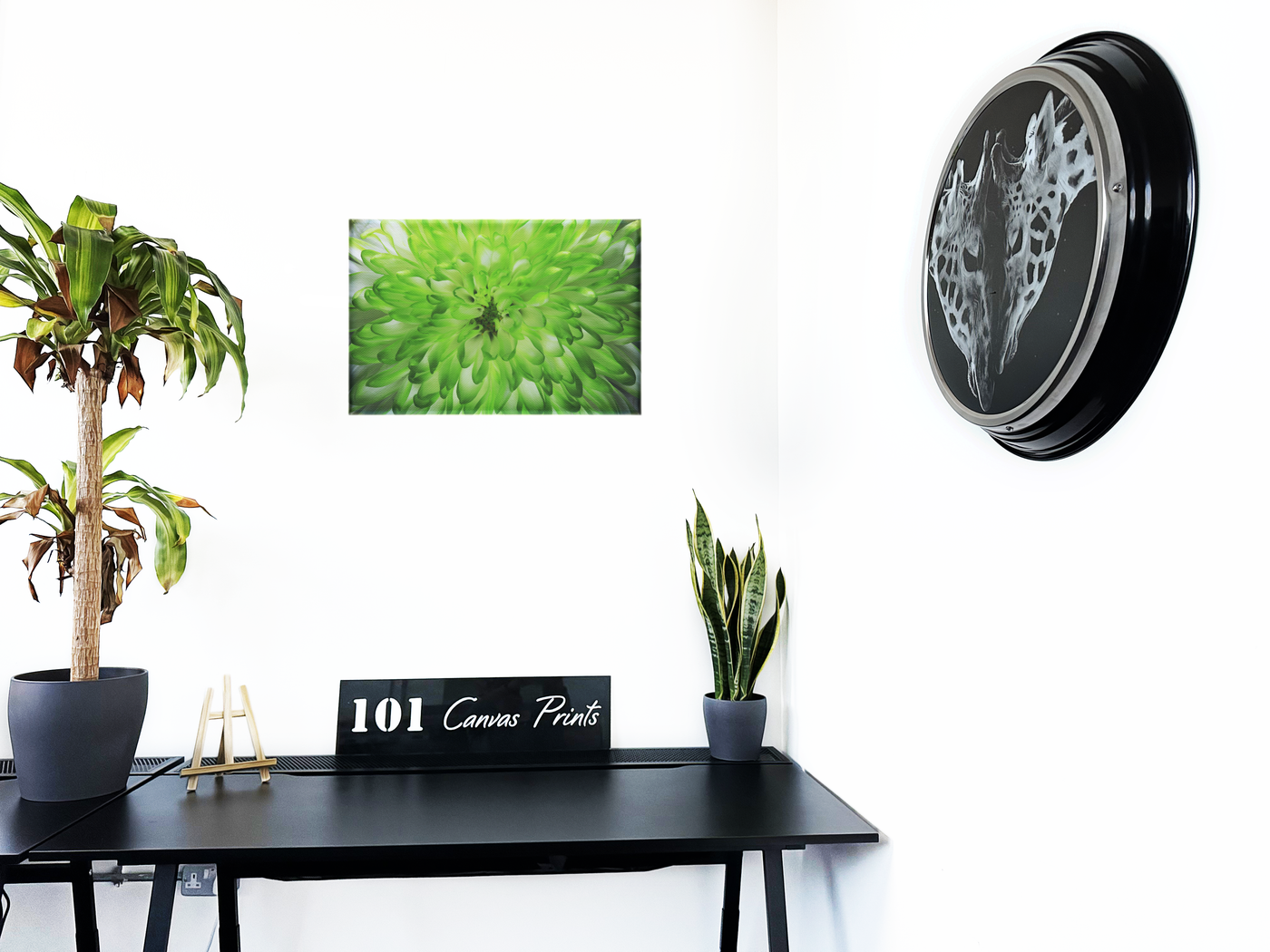Immerse yourself in the lush world of botanicals with this extraordinary Canvas Art print from 101 Canvas Prints. Our expert photography team has captured a mesmerising close-up of a Chrysanthemum flower in an enchanting shade of lime green. This image offers viewers an intimate look at the flower's complex structure, revealing a hypnotic array of petals that seem to unfurl endlessly towards the edges of the frame.