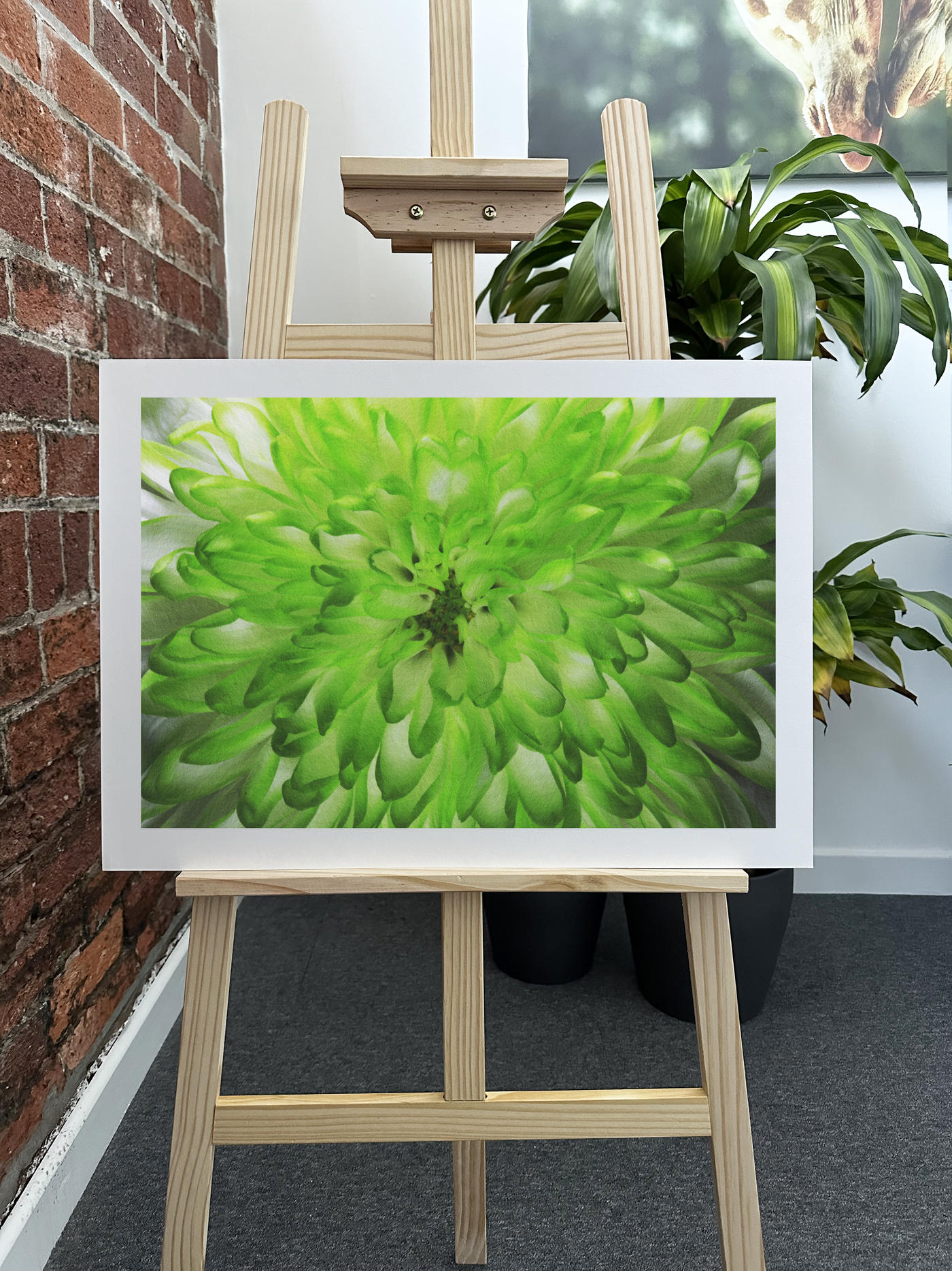 Immerse yourself in the lush world of botanicals with this extraordinary Fine Art print from 101 Canvas Prints. Our expert photography team has captured a mesmerising close-up of a Chrysanthemum flower in an enchanting shade of lime green. This image offers viewers an intimate look at the flower's complex structure, revealing a hypnotic array of petals that seem to unfurl endlessly towards the edges of the frame.