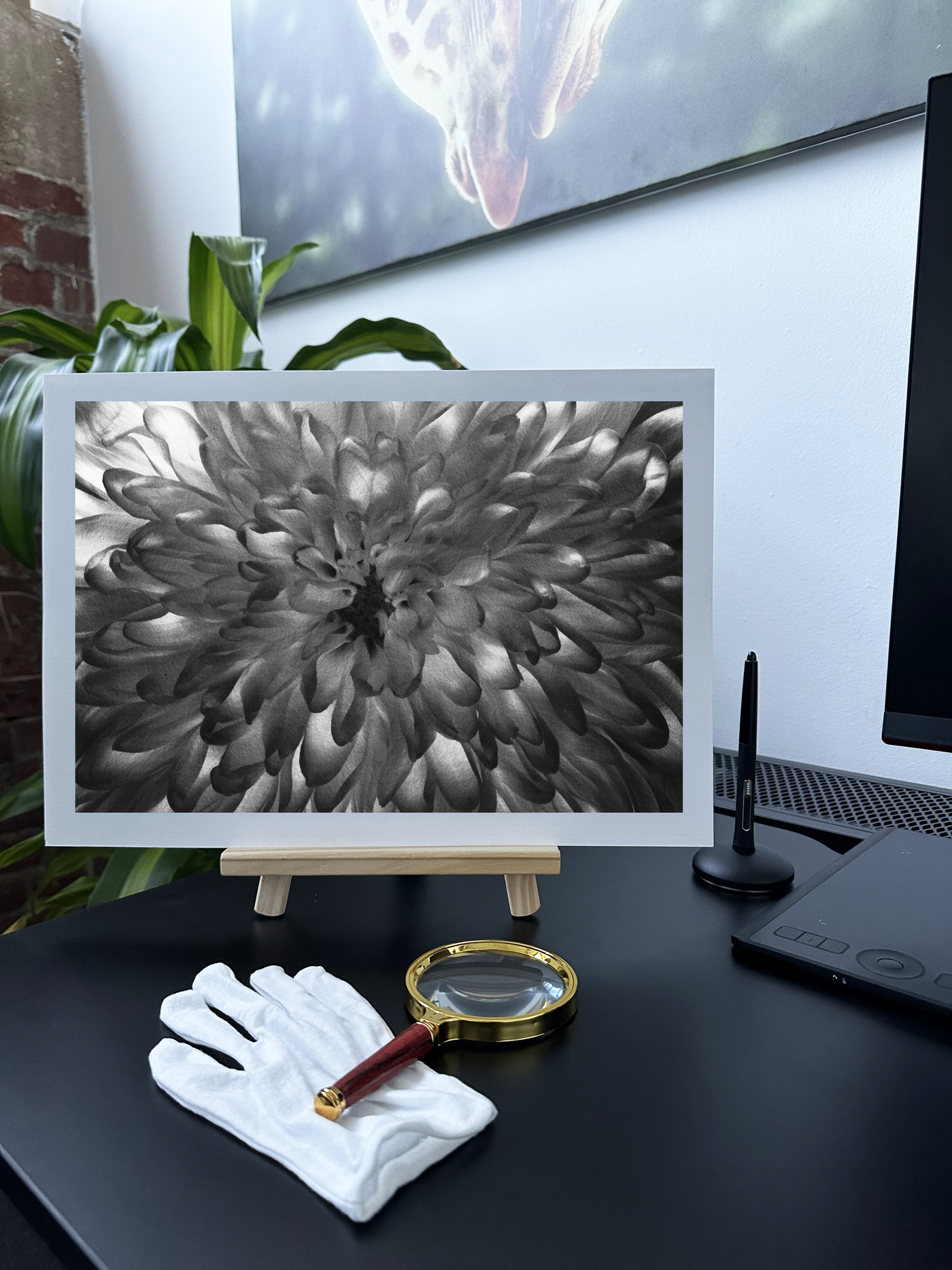 Our carefully handmade monochrome fine art prints are produced on Hahnemühle 308 matte cotton rag paper using Epson archival inks for exceptional detail and color accuracy. Each print features clean, precise edges and a textured surface that brings depth and richness to your chosen artwork, creating a gallery-worthy presentation.