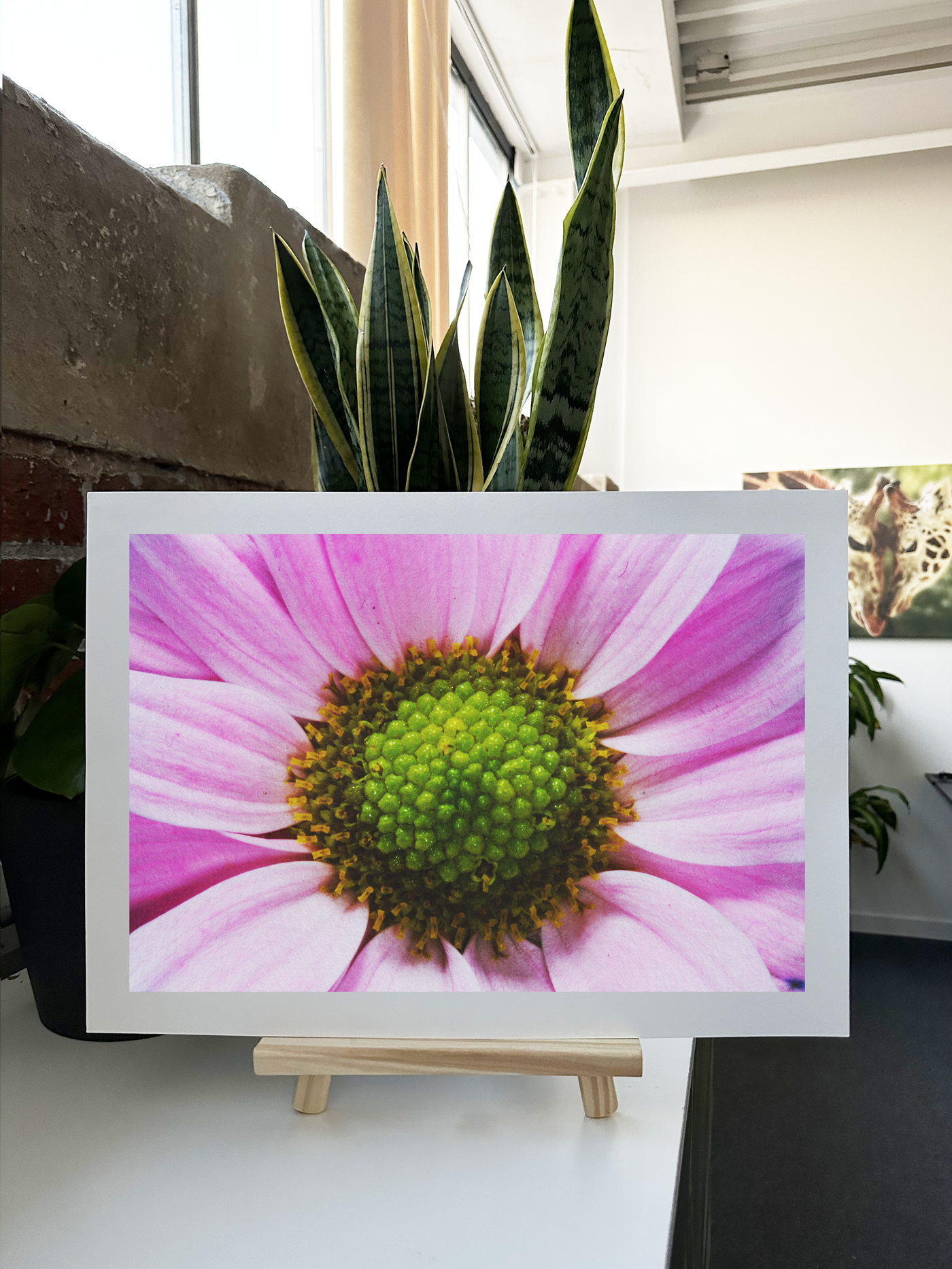 Immerse yourself in the delicate beauty of nature with this exquisite Fine Art print from 101 Canvas Prints. Our skilled photography team has captured a mesmerising close-up of a Daisy, showcasing its soft pink petals and intricate green centre. The image offers viewers an intimate look at the flower's complex structure, revealing details often overlooked by the casual observer.