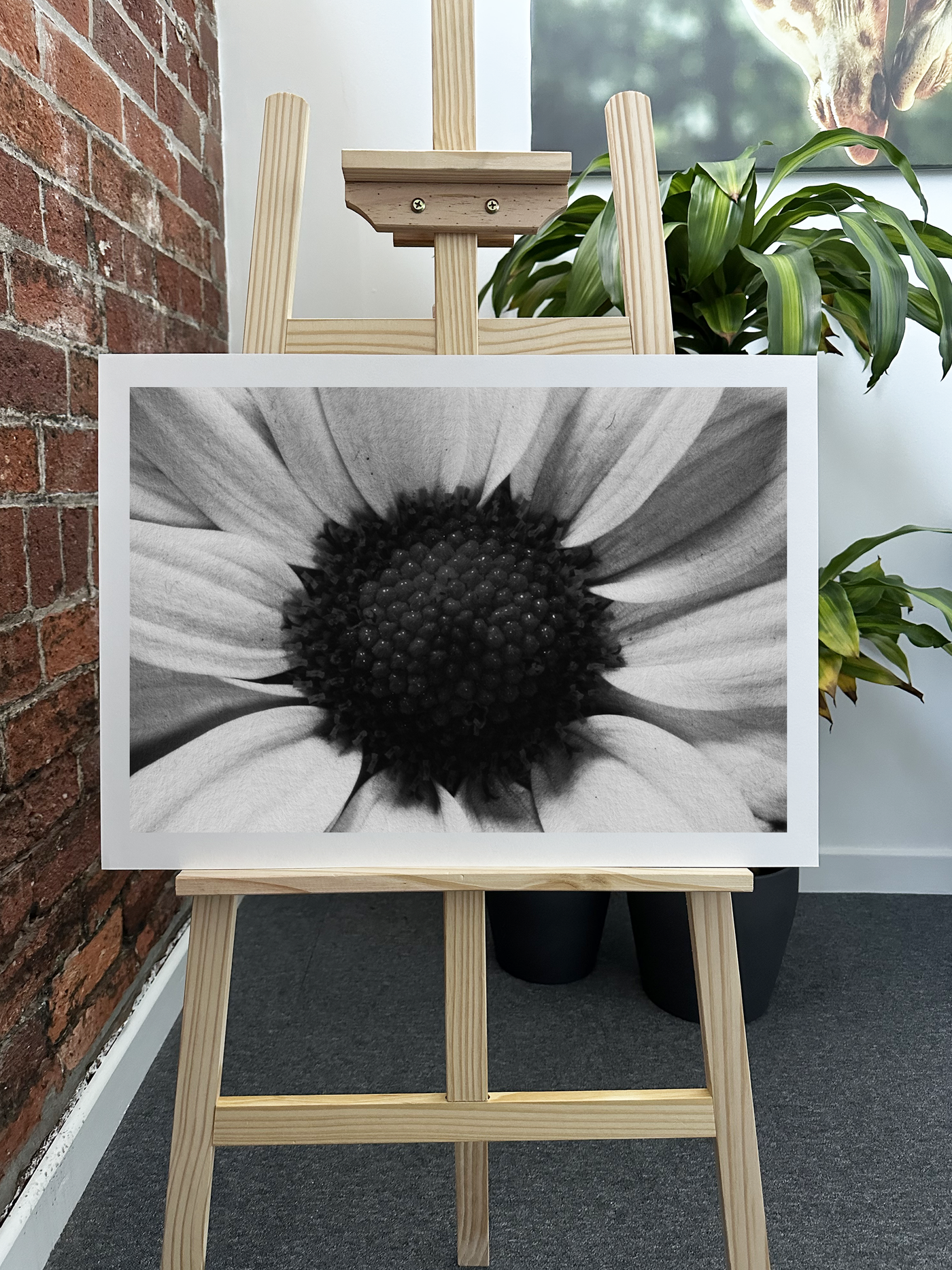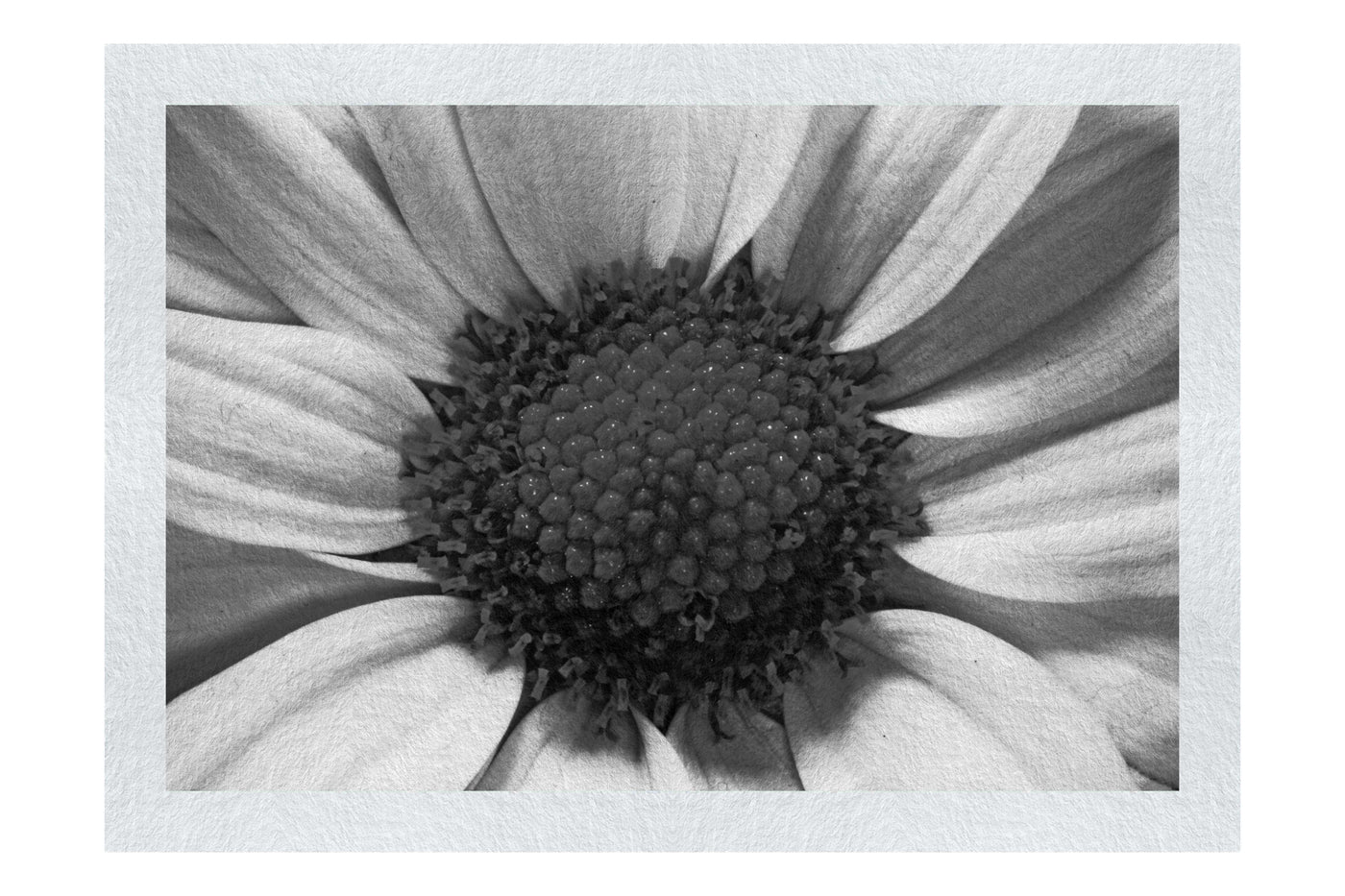 Immerse yourself in the delicate beauty of nature with this exquisite Monochrome Fine Art print from 101 Canvas Prints. Our skilled photography team has captured a mesmerising close-up of a Daisy, showcasing its soft light petals and intricate darker centre. The image offers viewers an intimate look at the flower's complex structure, revealing details often overlooked by the casual observer.