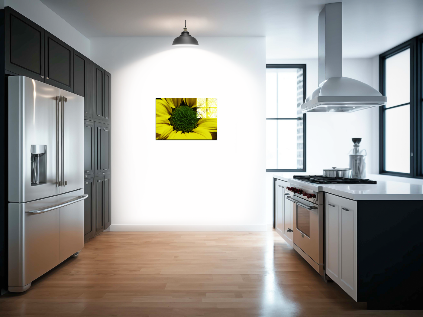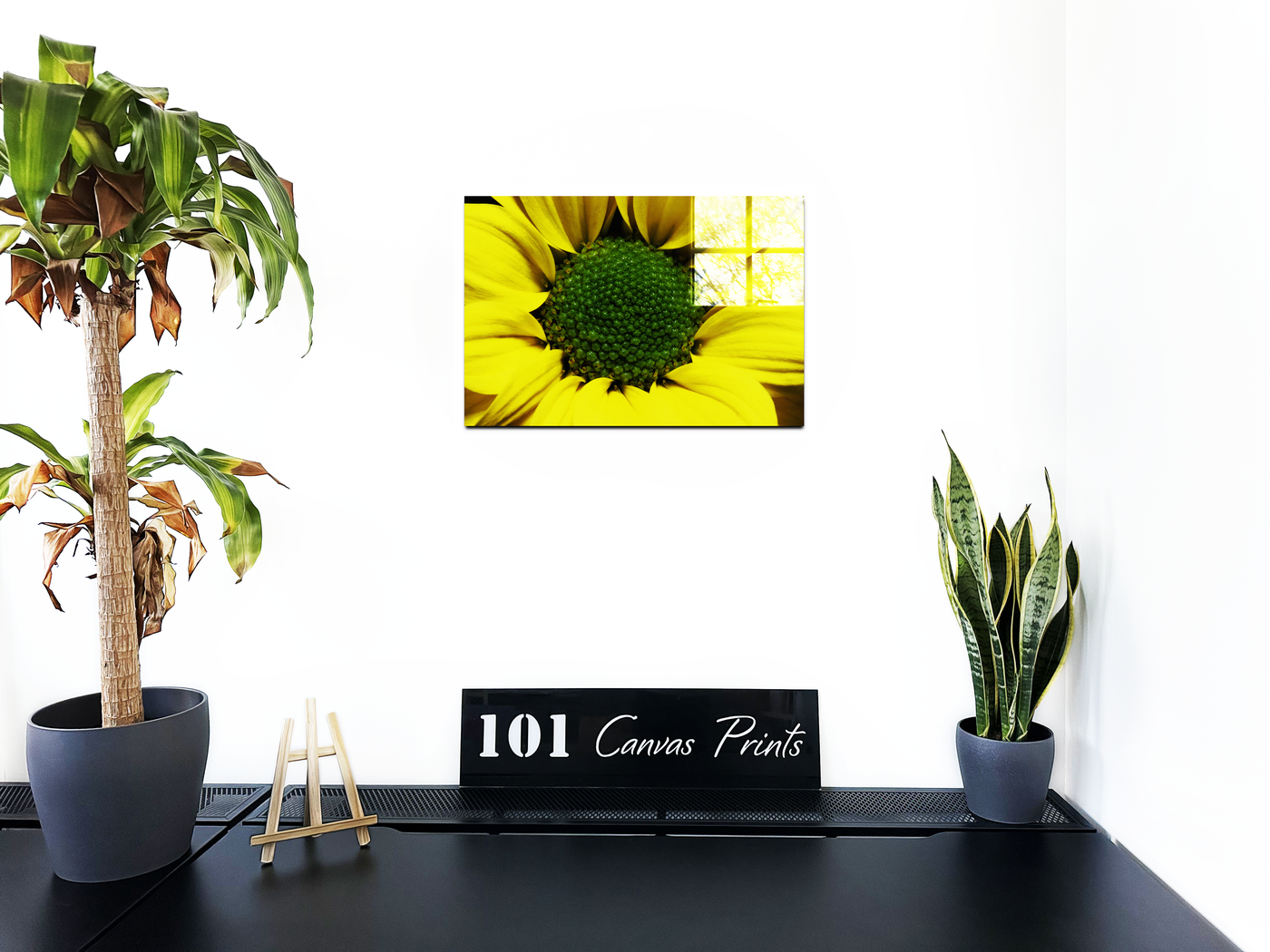 Experience the magnificence of nature up close with this breathtaking Acrylic print from 101 Canvas Prints. Our expert photographers have masterfully captured the essence of a sunflower, presenting a stunning macro view that reveals the flower's intricate details. This image offers a unique perspective, drawing the viewer into the heart of the bloom and showcasing the fascinating interplay between the bright yellow petals and the complex green centre.