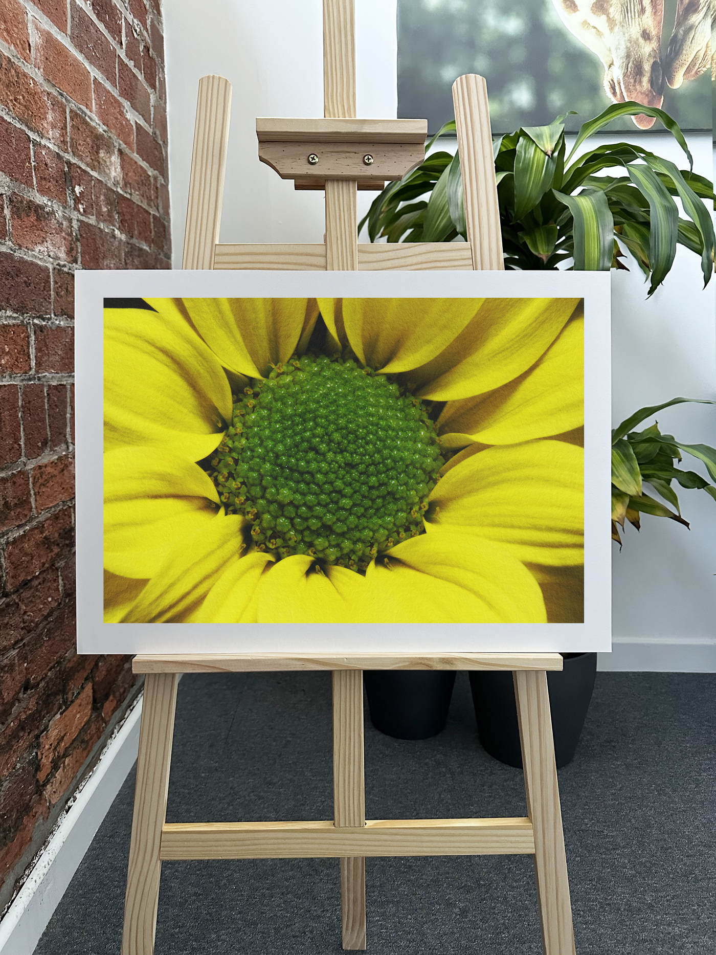 Dive into the heart of nature with this stunning Fine Art print from 101 Canvas Prints. Our skilled photography team has captured an extraordinarily detailed close-up of a sunflower in full bloom, showcasing the intricate beauty of this beloved flower. The image presents a perfect balance of the vibrant yellow petals surrounding the mesmerising green centre, offering viewers an intimate look at the flower's complex structure.