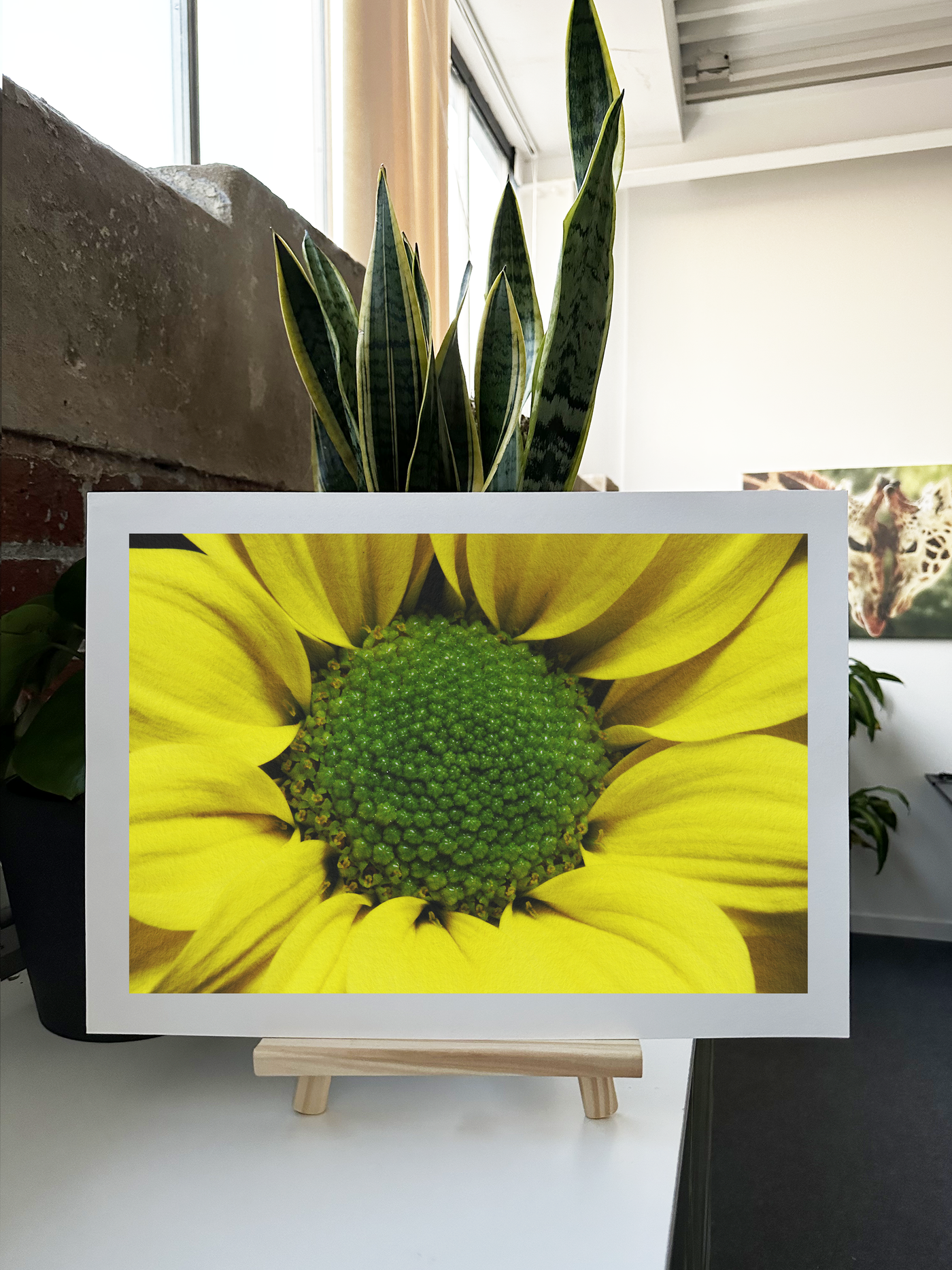 Dive into the heart of nature with this stunning Fine Art print from 101 Canvas Prints. Our skilled photography team has captured an extraordinarily detailed close-up of a sunflower in full bloom, showcasing the intricate beauty of this beloved flower. The image presents a perfect balance of the vibrant yellow petals surrounding the mesmerising green centre, offering viewers an intimate look at the flower's complex structure.