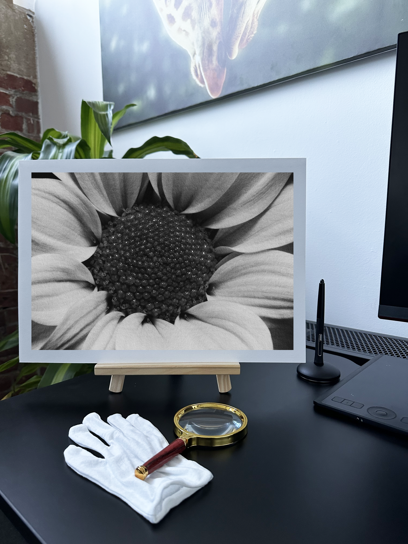 Our carefully handmade monochrome fine art prints are produced on Hahnemühle 308 matte cotton rag paper using Epson archival inks for exceptional detail and color accuracy. Each print features clean, precise edges and a textured surface that brings depth and richness to your chosen artwork, creating a gallery-worthy presentation.