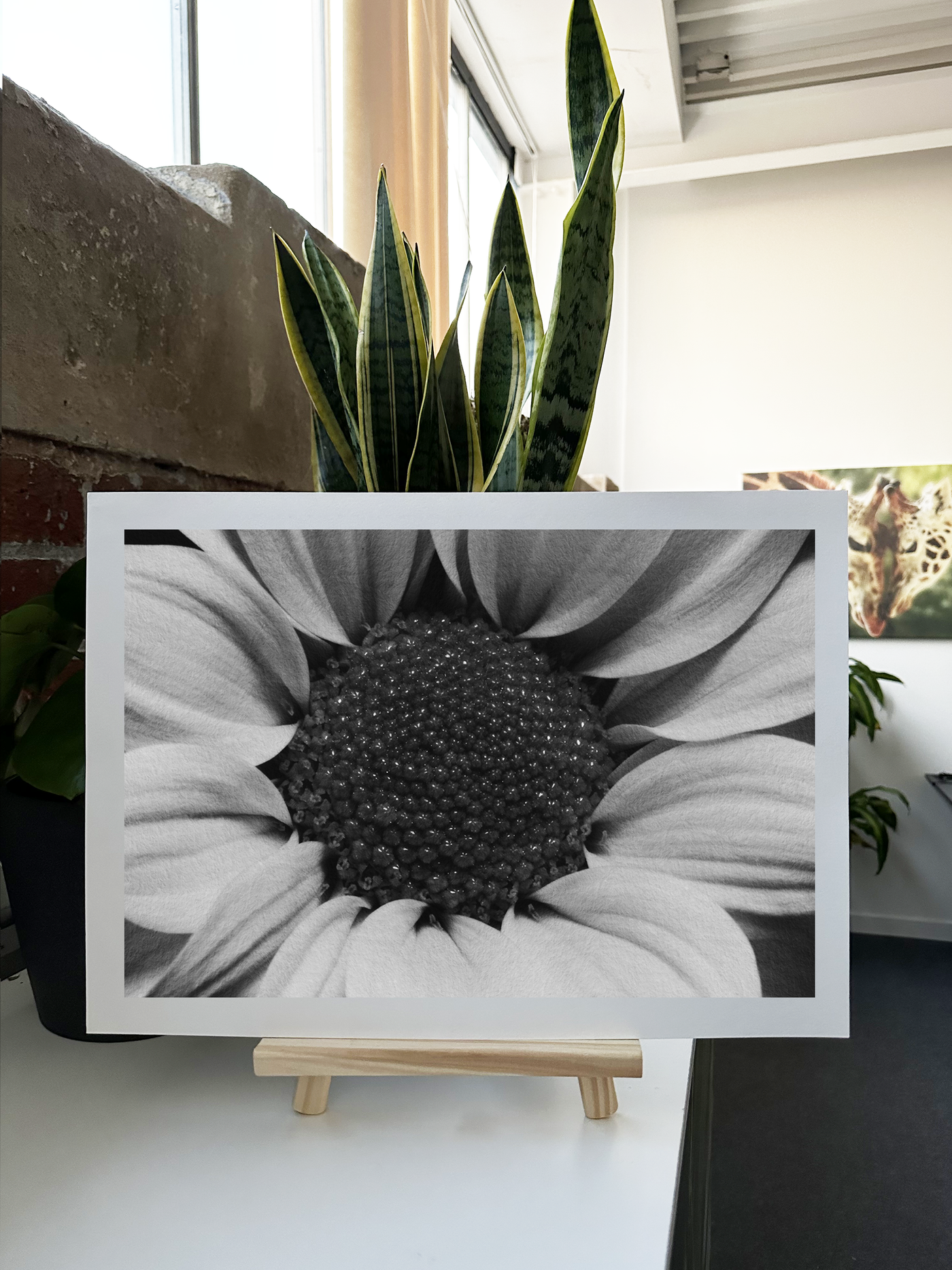 Dive into the heart of nature with this stunning Monochrome Fine Art print from 101 Canvas Prints. Our skilled photography team has captured an extraordinarily detailed close-up of a sunflower in full bloom, showcasing the intricate beauty of this beloved flower. The image presents a perfect balance of the vibrant slivery petals surrounding the mesmerising grey centre, offering viewers an intimate look at the flower's complex structure.