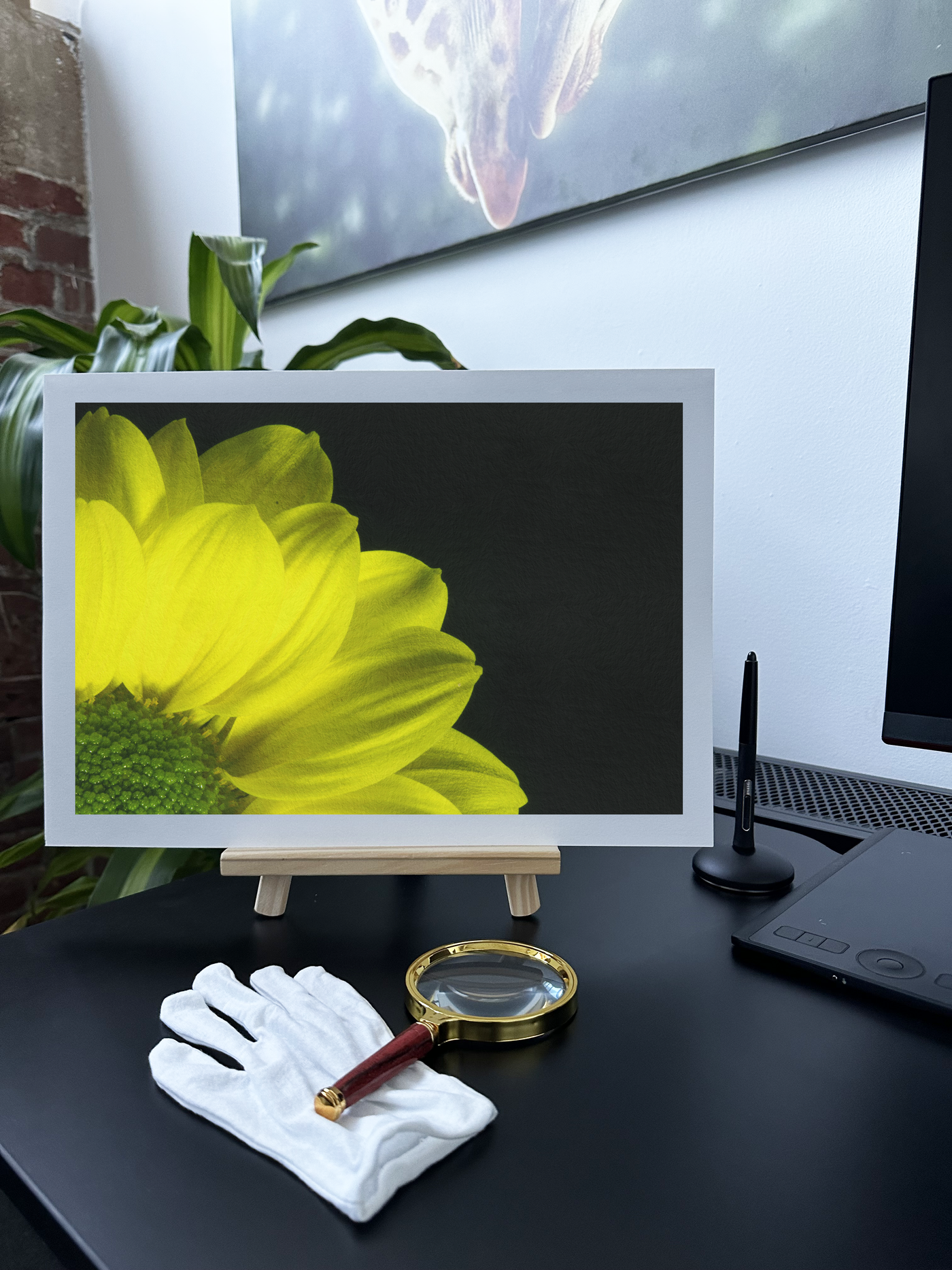 Our premium Fine Art paper beautifully captures the texture and depth of this image. The slightly matte finish of the Fine Art print softens the contrast just enough to create a harmonious balance between the vibrant subject and the moody background. This piece would make a striking focal point in any room, bringing a burst of sunshine and artistic flair to your living space or office.