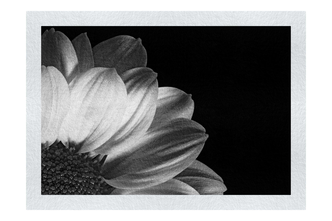 Immerse yourself in the vibrant beauty of nature with this stunning Monochrome Fine Art print from 101 Canvas Prints. Our talented photography team has captured a breathtaking close-up of a sunflower, showcasing its radiant silvery petals against a deep, dark background. The image offers a unique perspective, focusing on a portion of the flower to create an abstract yet instantly recognisable composition.